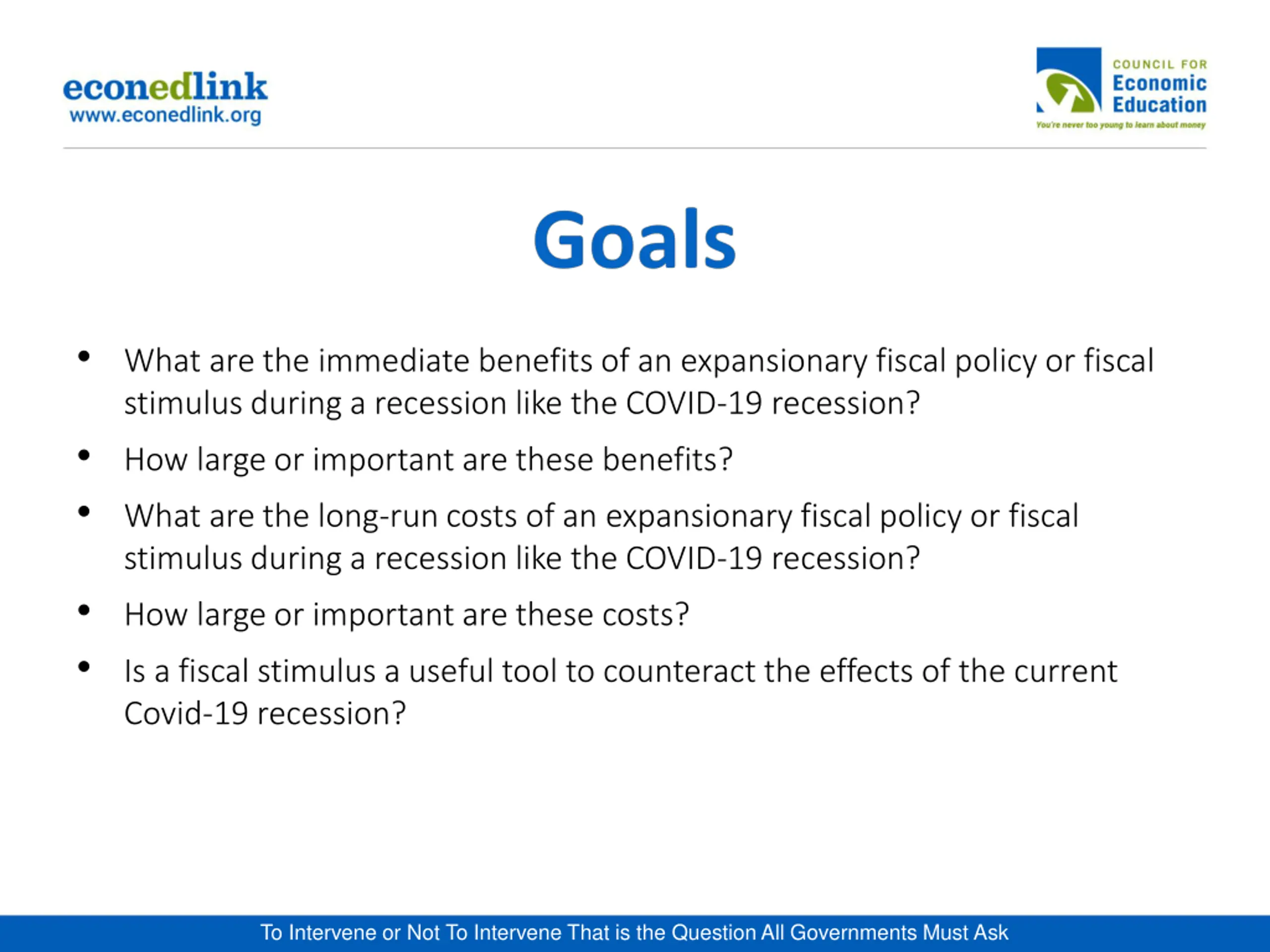What are the immediate benefits of an expansionary fiscal policy or fiscal stimulus during a recession like the COVID-19 recession? How large or important are these benefits? What are the long-run costs of an expansionary fiscal policy or fiscal stimulus during a recession like the COVID-19 recession? How large or important are these costs? Is a fiscal stimulus a useful tool to counteract the effects of the current Covid-19 recession? To Intervene or Not To Intervene That is the Question All Governments Must Ask
