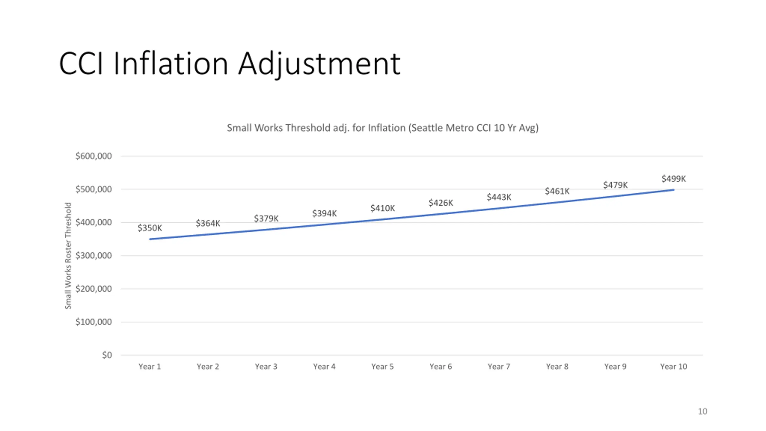 CCI Inflation Adjustment Small Works Threshold adj. for Inflation (Seattle Metro CCI 10 Yr Avg) $600,000 $499K $479K $500,000 $461K $443K $426K Small Works Roster Threshold $410K $394K $379K $400,000 $364K $350K $300,000 $200,000 $100,000 $0 Year 1 Year 2 Year 3 Year 4 Year 5 Year 6 Year 7 Year 8 Year 9 Year 10 10