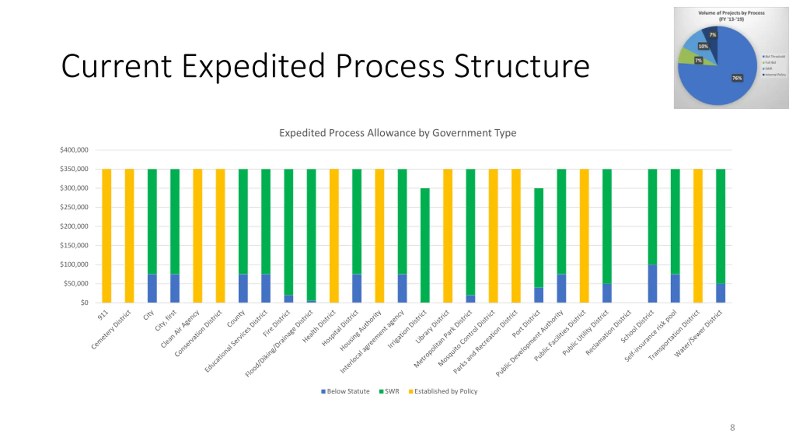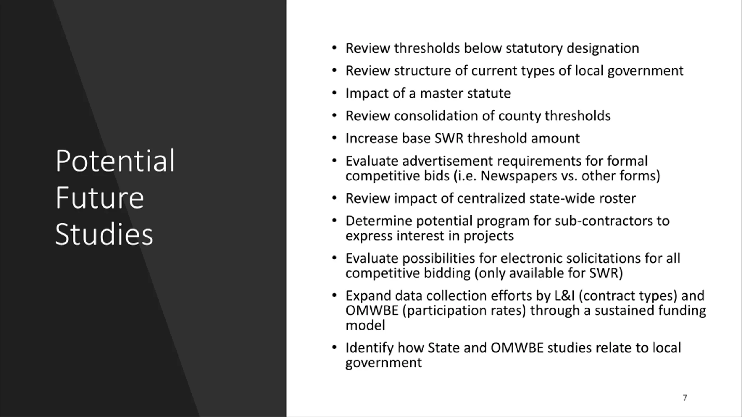 Review thresholds below statutory designation Review structure of current types of local government Impact of a master statute Review consolidation of county thresholds Increase base SWR threshold amount Evaluate advertisement requirements for formal competitive bids (i.e. Newspapers vs. other forms) Review impact of centralized state-wide roster Determine potential program for sub-contractors to express interest in projects Evaluate possibilities for electronic solicitations for all competitive bidding (only available for SWR) Expand data collection efforts by L&I (contract types) and OMWBE (participation rates) through a sustained funding model Identify how State and OMWBE studies relate to local government Potential Future Studies