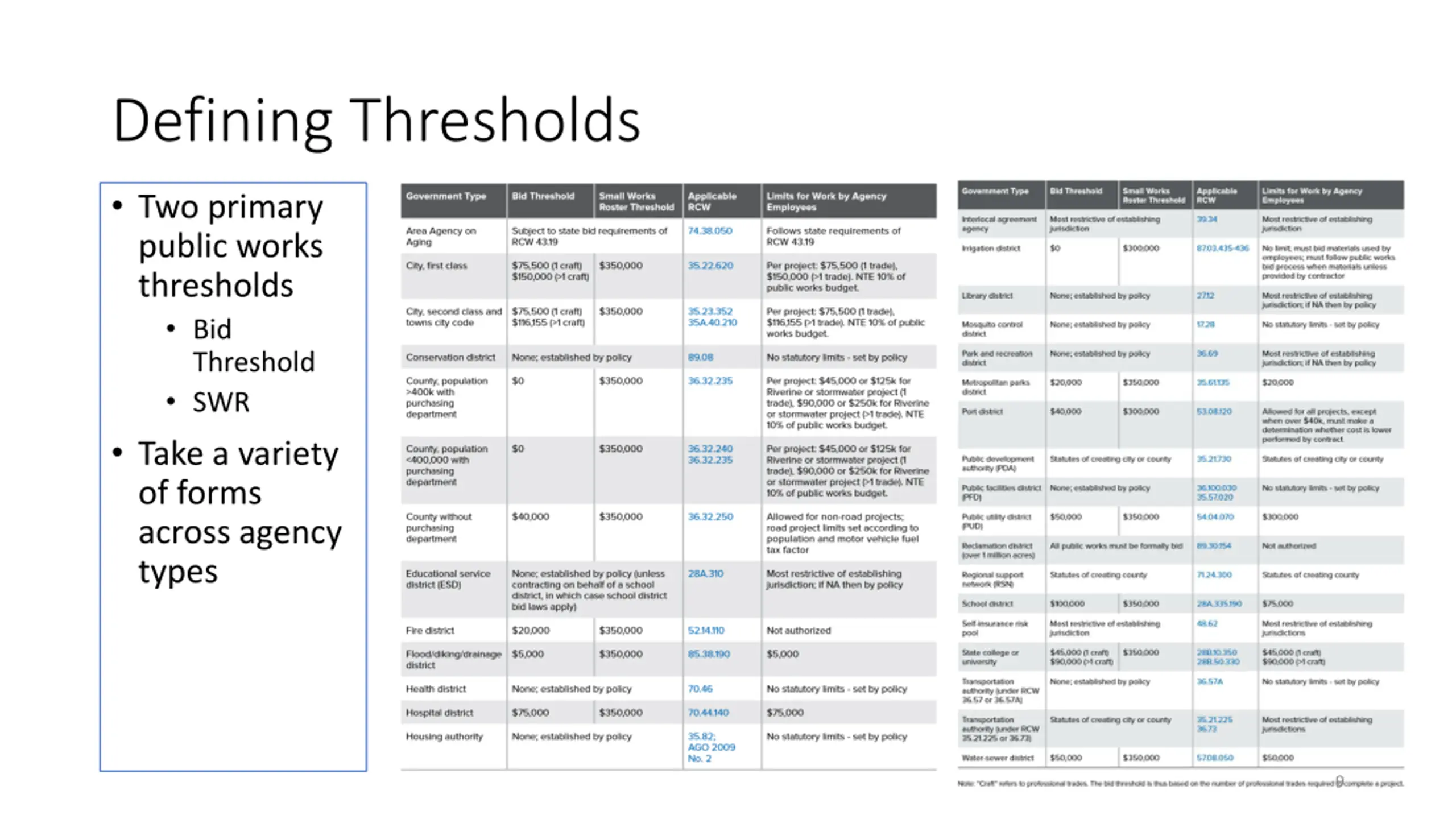 Defining Thresholds Two primary public works thresholds Bid Threshold SWR Take a variety of forms across agency types 9