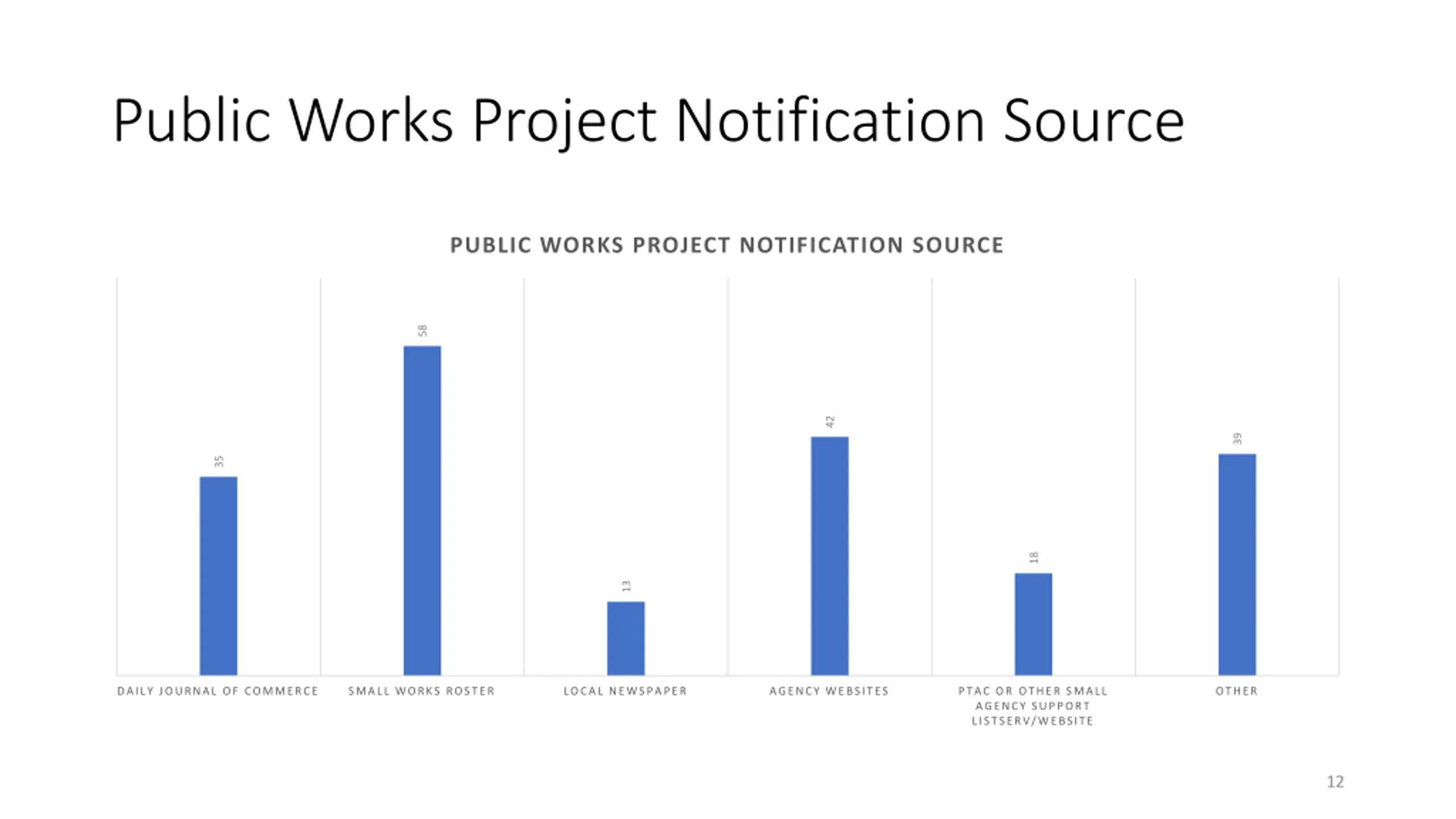 Public Works Project Notification Source PUBLIC WORKS PROJECT NOTIFICATION SOURCE 58 42 39 35 18 13 DAILY JOURNAL OF COMMERCE SMALL WORKS ROSTER LOCAL NEWSPAPER AGENCY WEBSITES PTAC OR OTHER SMALL AGENCY SUPPORT LISTSERV/WEBSITE OTHER 12