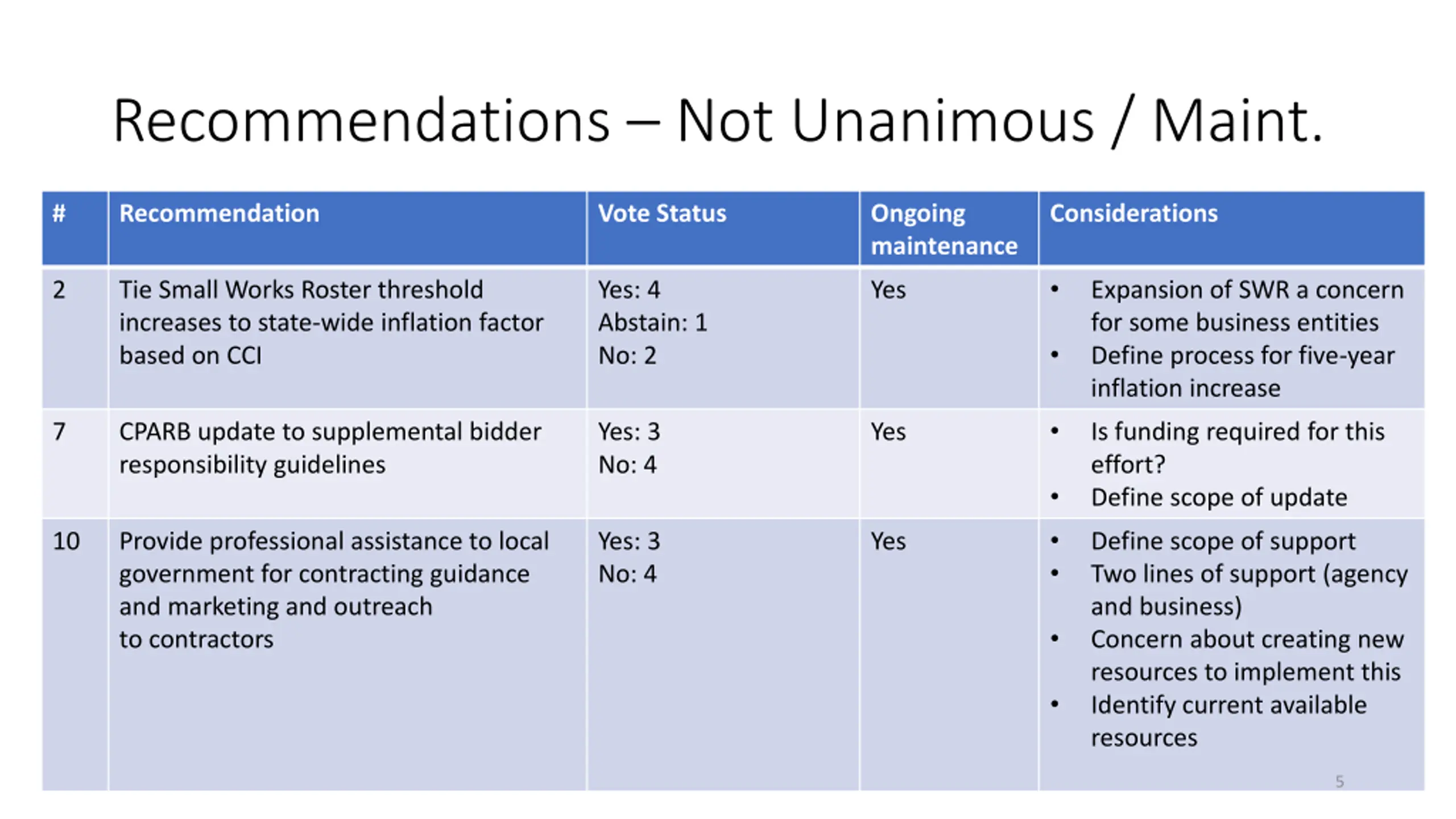Recommendations Not Unanimous / Maint. # Recommendation Vote Status Ongoing maintenance Considerations 2 Tie Small Works Roster threshold increases to state-wide inflation factor based on CCI Yes: 4 Abstain: 1 No: 2 Yes Expansion of SWR a concern for some business entities Define process for five-year inflation increase 7 CPARB update to supplemental bidder responsibility guidelines Yes: 3 No: 4 Yes Is funding required for this effort? Define scope of update 10 Provide professional assistance to local government for contracting guidance and marketing and outreach to contractors Yes: 3 No: 4 Yes Define scope of support Two lines of support (agency and business) Concern about creating new resources to implement this Identify current available resources 5