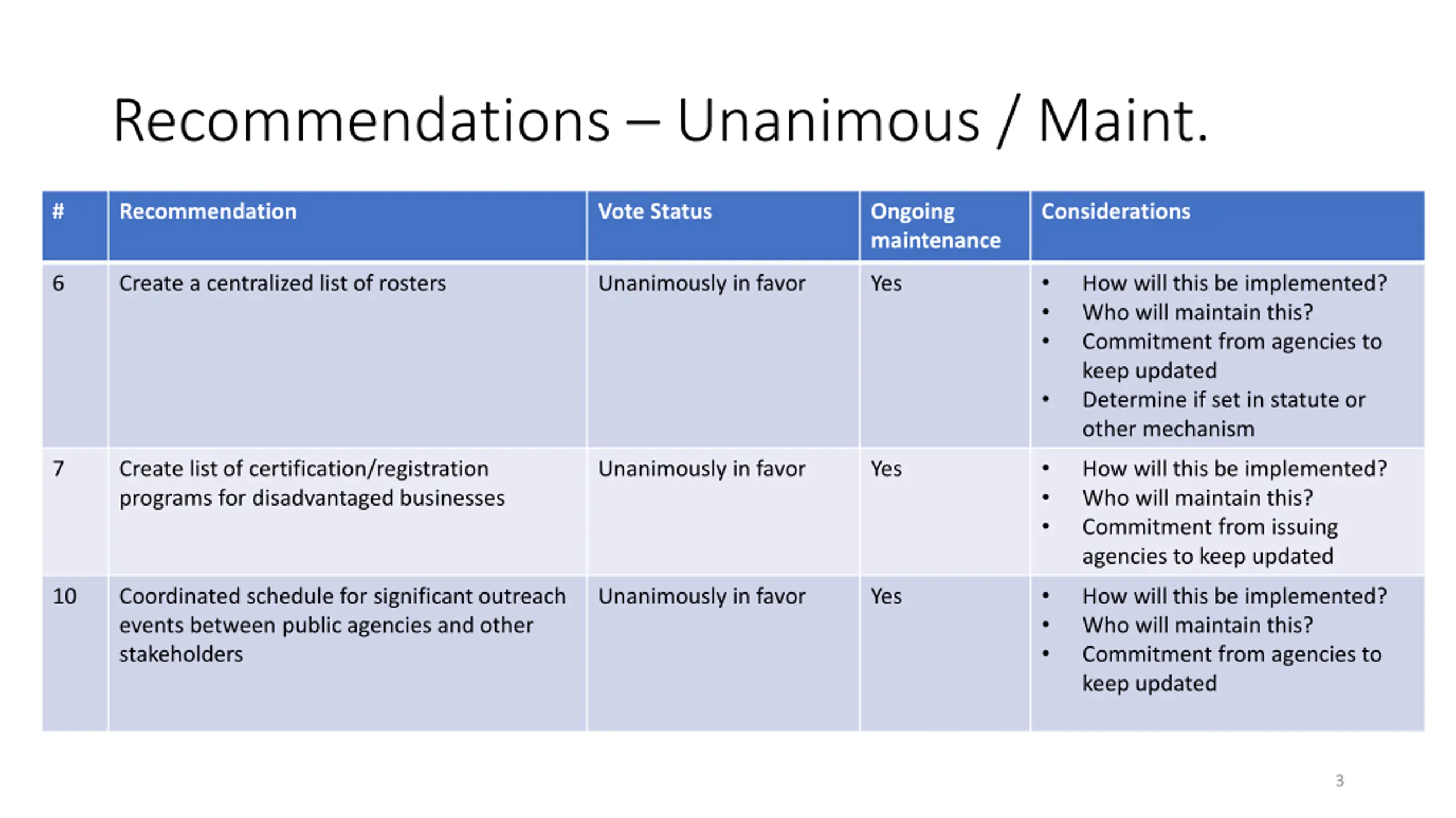 Recommendations Unanimous / Maint. # Recommendation Vote Status Ongoing maintenance Considerations 6 Create a centralized list of rosters Unanimously in favor Yes How will this be implemented? Who will maintain this? Commitment from agencies to keep updated Determine if set in statute or other mechanism 7 Create list of certification/registration programs for disadvantaged businesses Unanimously in favor Yes How will this be implemented? Who will maintain this? Commitment from issuing agencies to keep updated 10 Coordinated schedule for significant outreach events between public agencies and other stakeholders Unanimously in favor Yes How will this be implemented? Who will maintain this? Commitment from agencies to keep updated 3