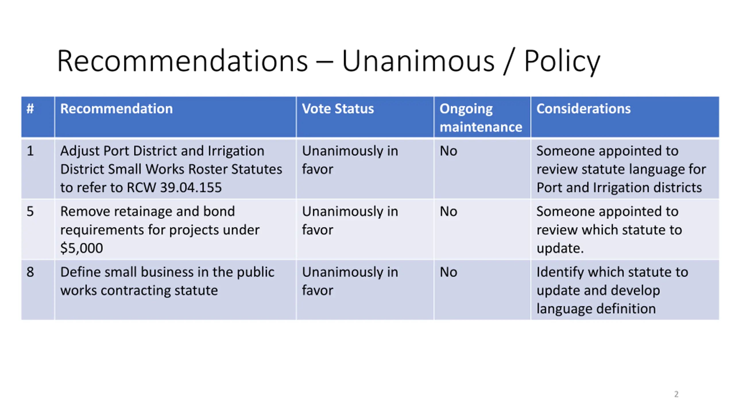Recommendations Unanimous / Policy # Recommendation Vote Status Ongoing maintenance Considerations 1 Adjust Port District and Irrigation District Small Works Roster Statutes to refer to RCW 39.04.155 Unanimously in favor No Someone appointed to review statute language for Port and Irrigation districts 5 Remove retainage and bond requirements for projects under $5,000 Unanimously in favor No Someone appointed to review which statute to update. 8 Define small business in the public works contracting statute Unanimously in favor No Identify which statute to update and develop language definition 2