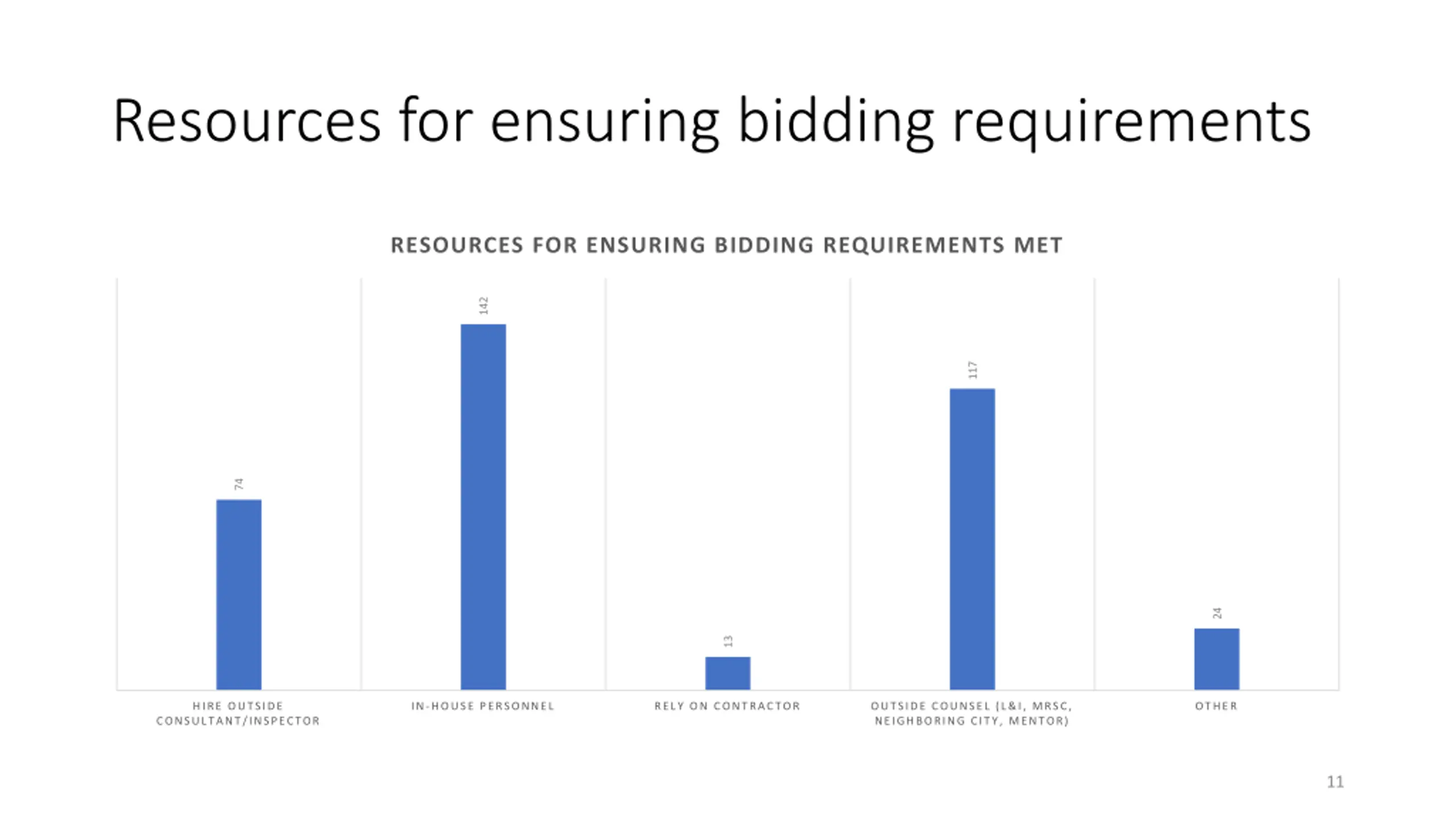 Resources for ensuring bidding requirements RESOURCES FOR ENSURING BIDDING REQUIREMENTS MET 142 117 74 24 13 HIRE OUTSIDE CONSULTANT/INSPECTOR IN-HOUSE PERSONNEL RELY ON CONTRACTOR OUTSIDE COUNSEL (L&I, MRSC, NEIGHBORING CITY, MENTOR) OTHER 11