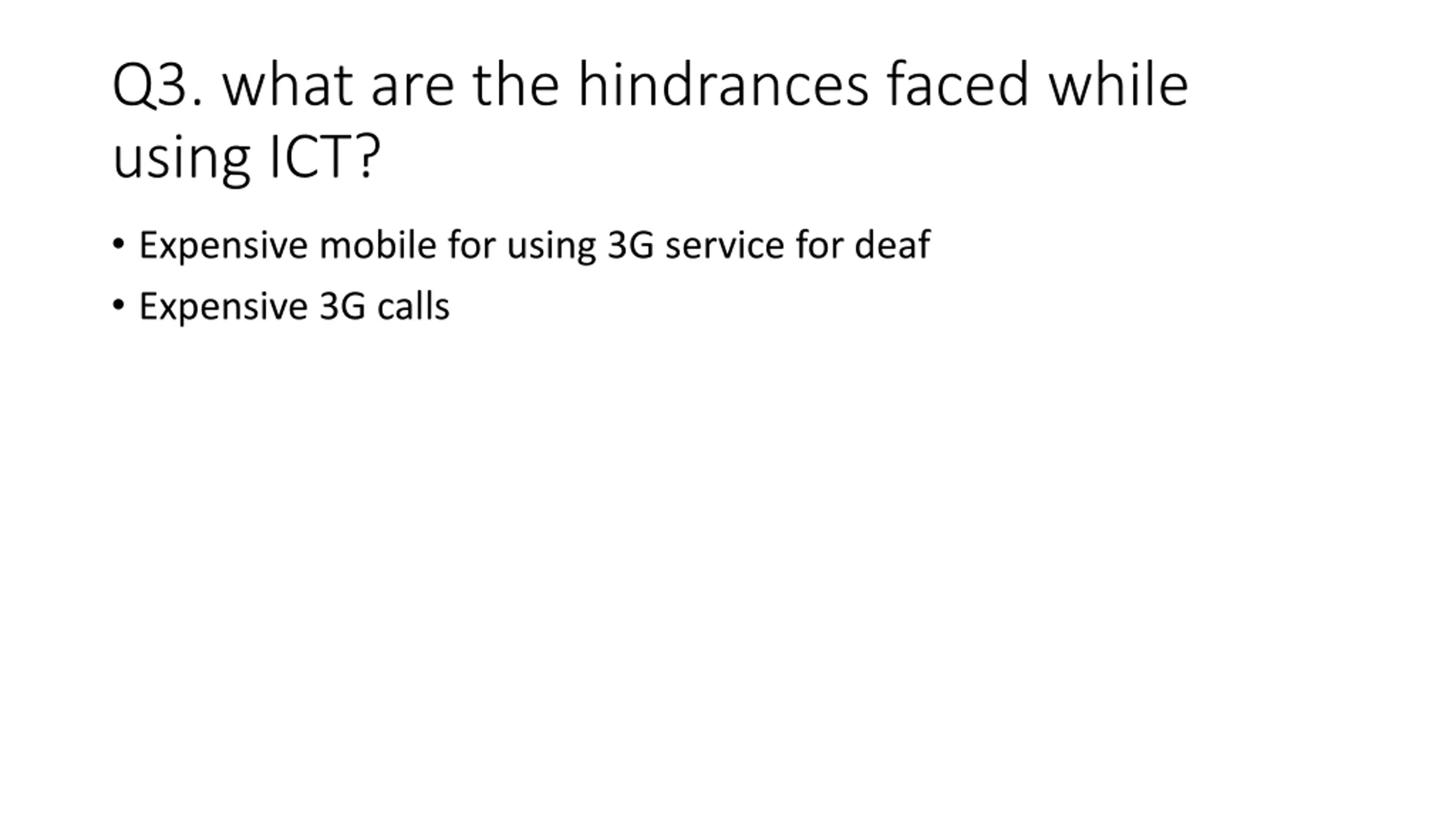 Q3. what are the hindrances faced while using ICT? Expensive mobile for using 3G service for deaf Expensive 3G calls
