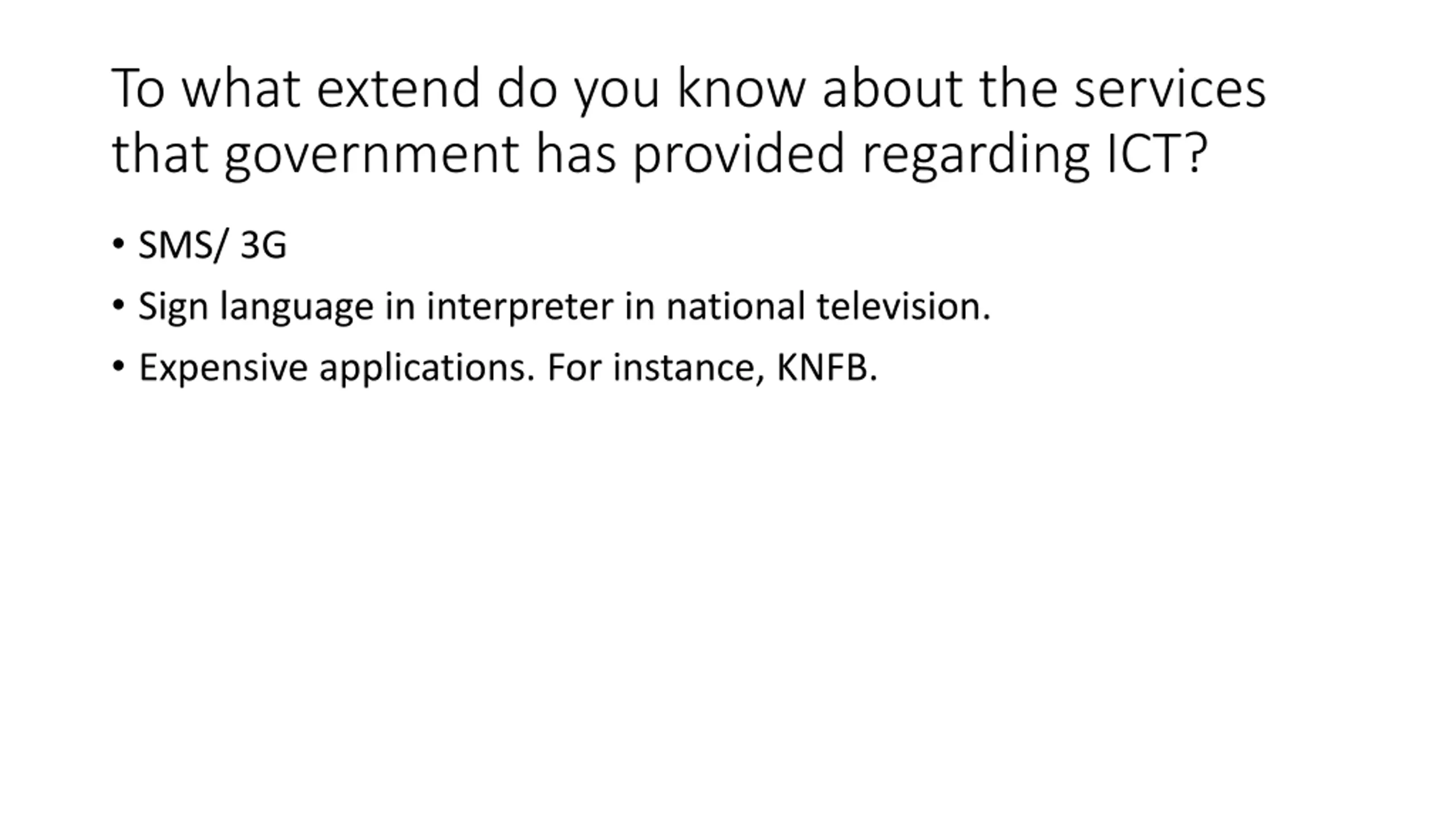 To what extend do you know about the services that government has provided regarding ICT? SMS/ 3G Sign language in interpreter in national television. Expensive applications. For instance, KNFB.