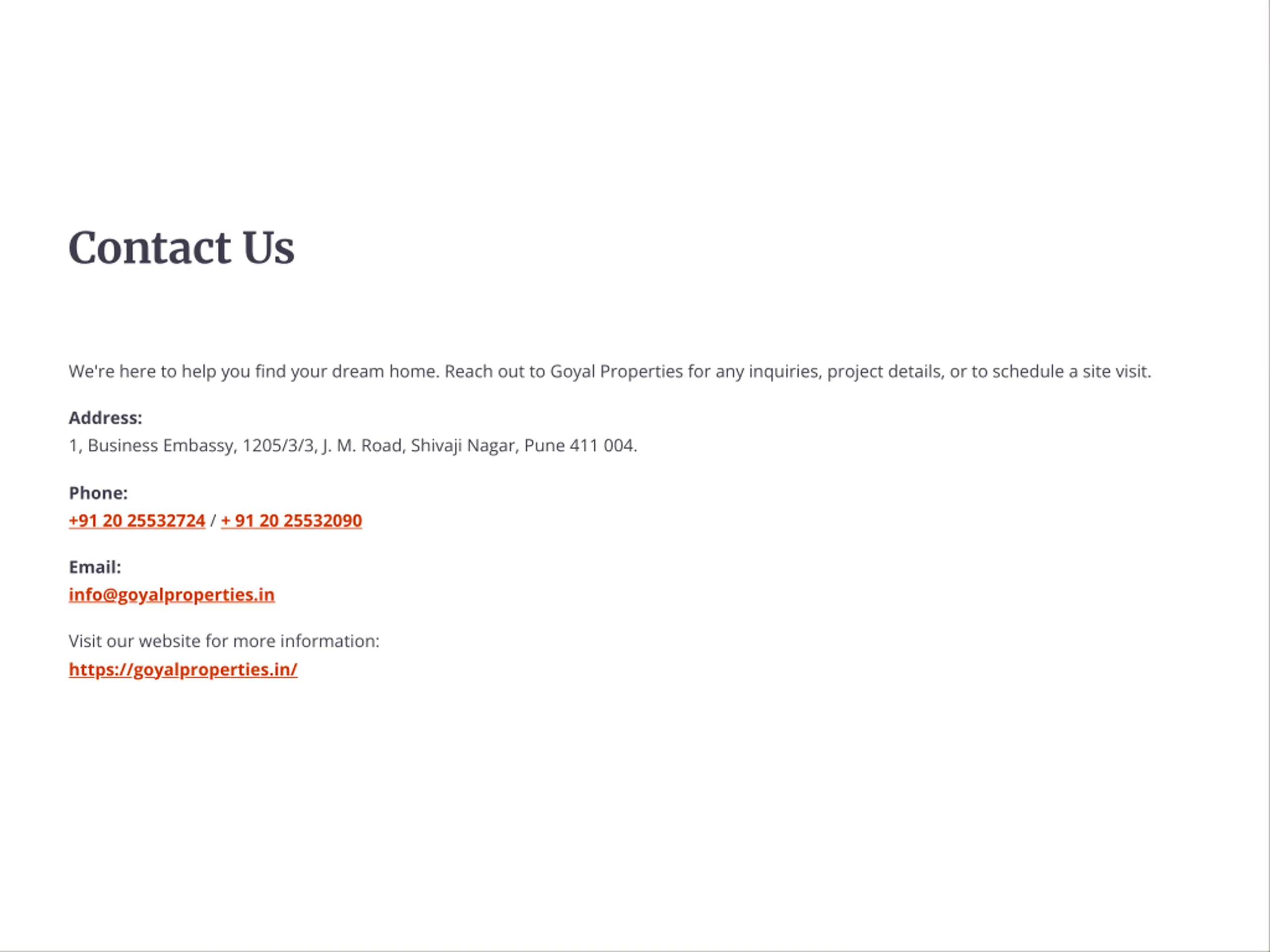 Contact Us We're here to help you find your dream home. Reach out to Goyal Properties for any inquiries, project details, or to schedule a site visit. Address: 1, Business Embassy, 1205/3/3, J. M. Road, Shivaji Nagar, Pune 411 004. Phone: +91 20 25532724 / + 91 20 25532090 Email: info@goyalproperties.in Visit our website for more information: https://goyalproperties.in/
