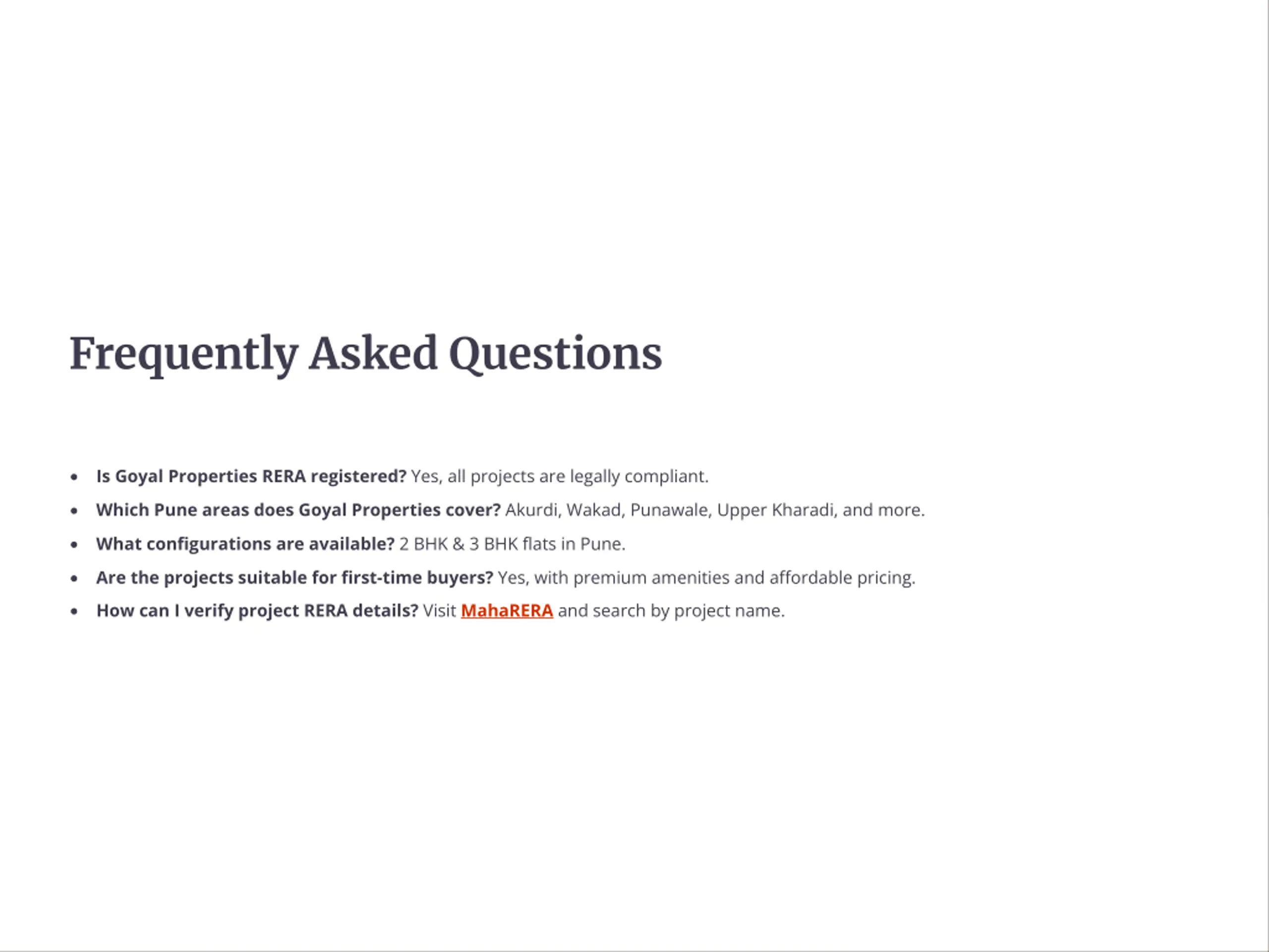 Frequently Asked Questions Is Goyal Properties RERA registered? Yes, all projects are legally compliant. Which Pune areas does Goyal Properties cover? Akurdi, Wakad, Punawale, Upper Kharadi, and more. What configurations are available? 2 BHK & 3 BHK flats in Pune. Are the projects suitable for first-time buyers? Yes, with premium amenities and affordable pricing. How can I verify project RERA details? Visit MahaRERA and search by project name.