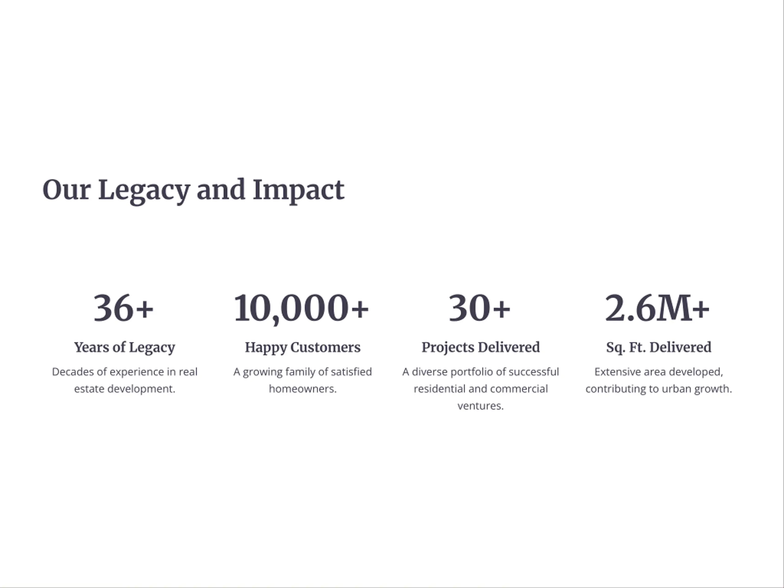 Our Legacy and Impact 36+ 10,000+ 30+ 2.6M+ Years of Legacy Happy Customers Projects Delivered Sq. Ft. Delivered Decades of experience in real estate development. A growing family of satisfied homeowners. A diverse portfolio of successful residential and commercial ventures. Extensive area developed, contributing to urban growth.