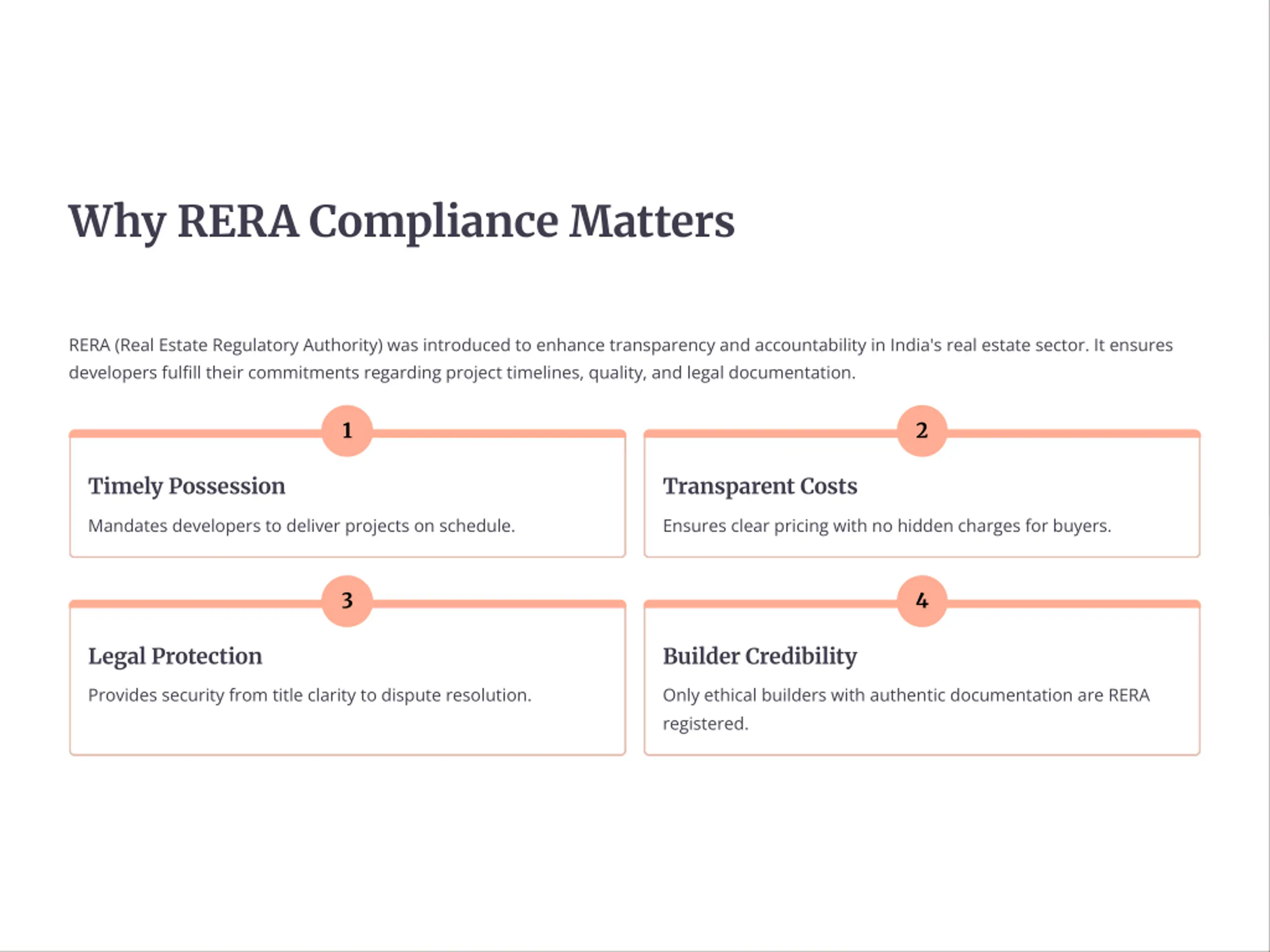 Wh RERA Cuace Mae RERA (Real Estate Regulatory Authority) was introduced to enhance transparency and accountability in India's real estate sector. It ensures developers fulfill their commitments regarding project timelines, quality, and legal documentation. 1 2 Tu e P e u T a a e C Mandates developers to deliver projects on schedule. Ensures clear pricing with no hidden charges for buyers. 3 4 Lega P ec u B u de C edubu u Provides security from title clarity to dispute resolution. Only ethical builders with authentic documentation are RERA registered.