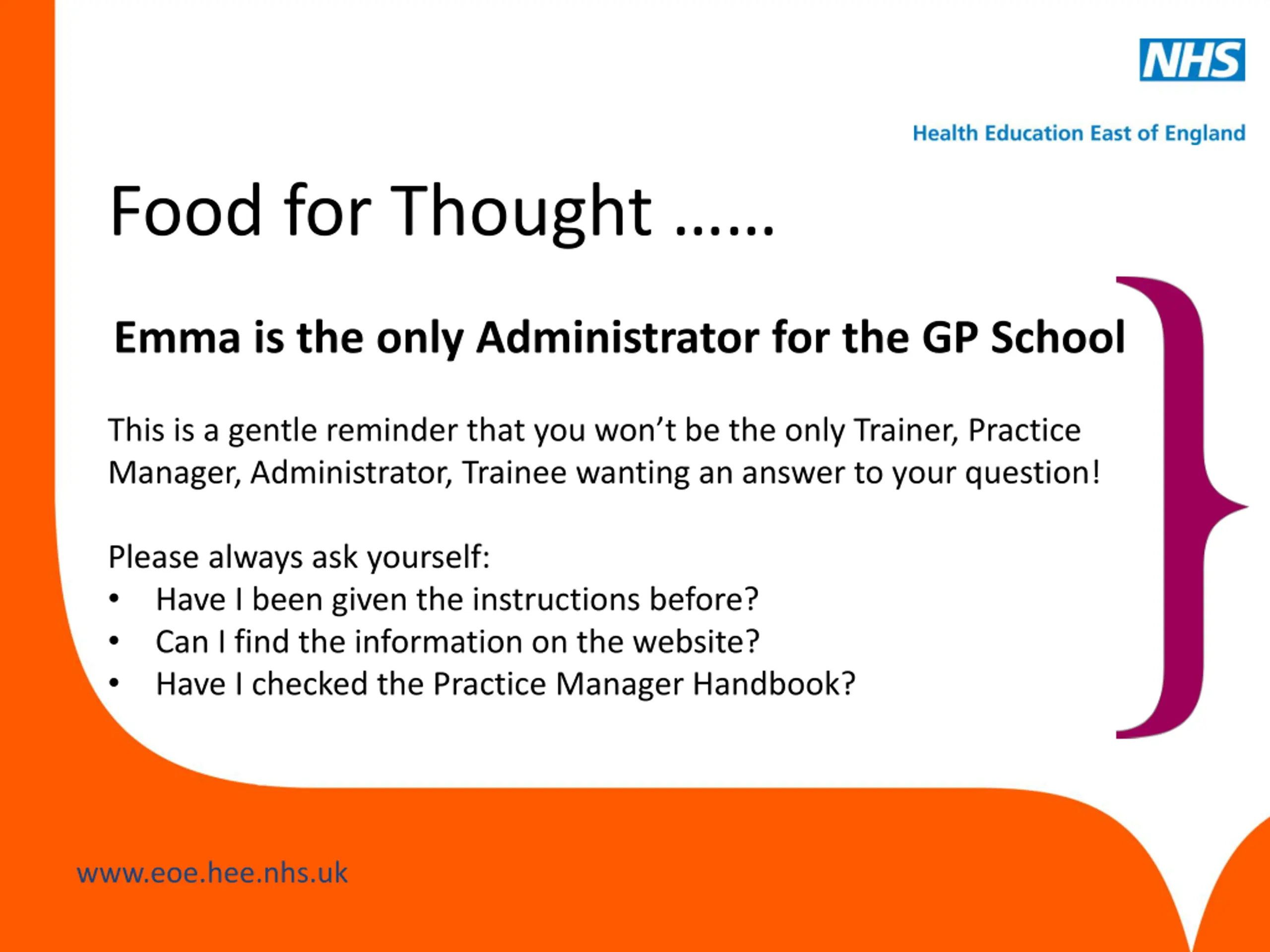 Food for Thought Emma is the only Administrator for the GP School This is a gentle reminder that you won t be the only Trainer, Practice Manager, Administrator, Trainee wanting an answer to your question! Please always ask yourself: Have I been given the instructions before? Can I find the information on the website? Have I checked the Practice Manager Handbook? www.hee.nhs.uk www.eoe.hee.nhs.uk