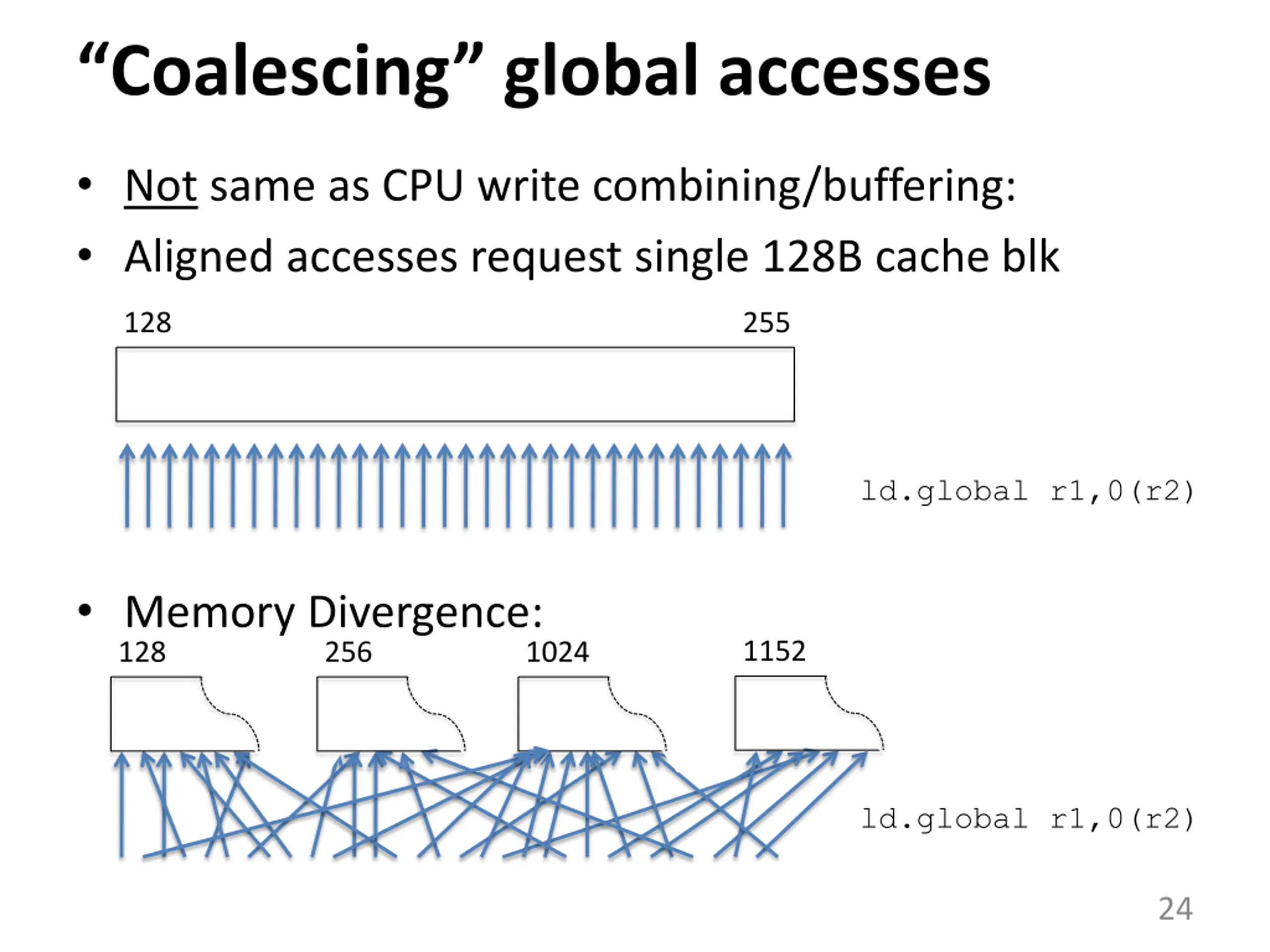 Coalescing global accesses Not same as CPU write combining/buffering: Aligned accesses request single 128B cache blk 128 255 ld.global r1,0(r2) Memory Divergence: 128 1152 256 1024 ld.global r1,0(r2) 24