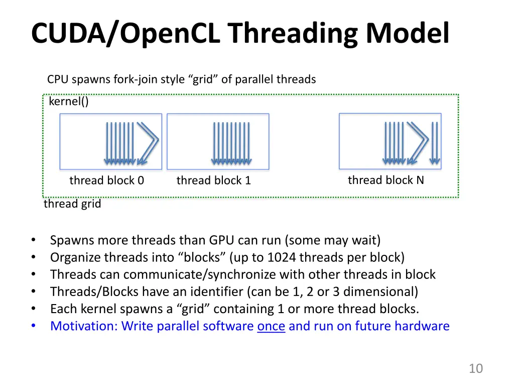 CUDA/OpenCL Threading Model CPU spawns fork-join style grid of parallel threads kernel() thread block N thread block 0 thread block 1 thread grid Spawns more threads than GPU can run (some may wait) Organize threads into blocks (up to 1024 threads per block) Threads can communicate/synchronize with other threads in block Threads/Blocks have an identifier (can be 1, 2 or 3 dimensional) Each kernel spawns a grid containing 1 or more thread blocks. Motivation: Write parallel software once and run on future hardware 10