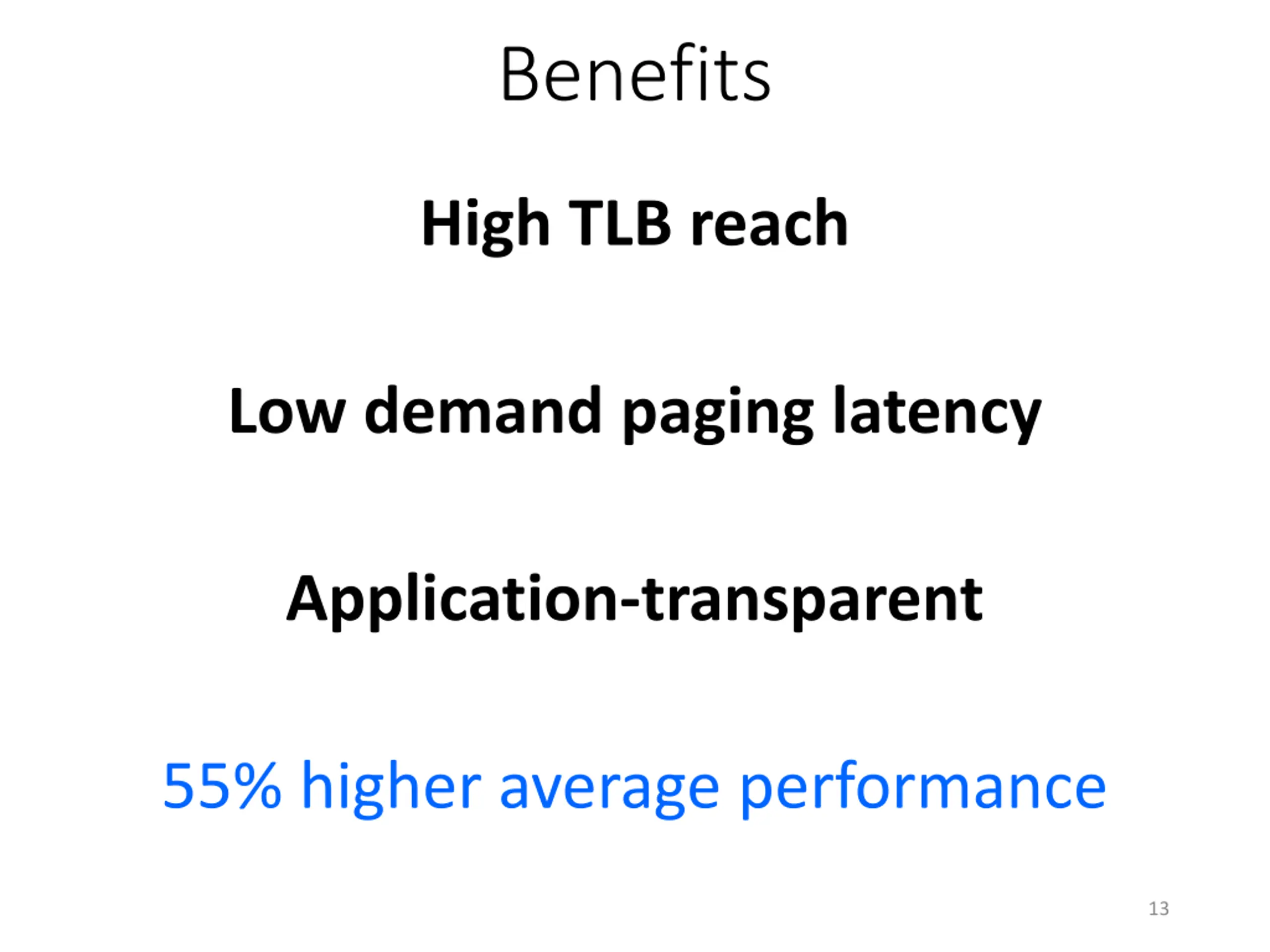 Benefits High TLB reach Low demand paging latency Application-transparent 55% higher average performance 13