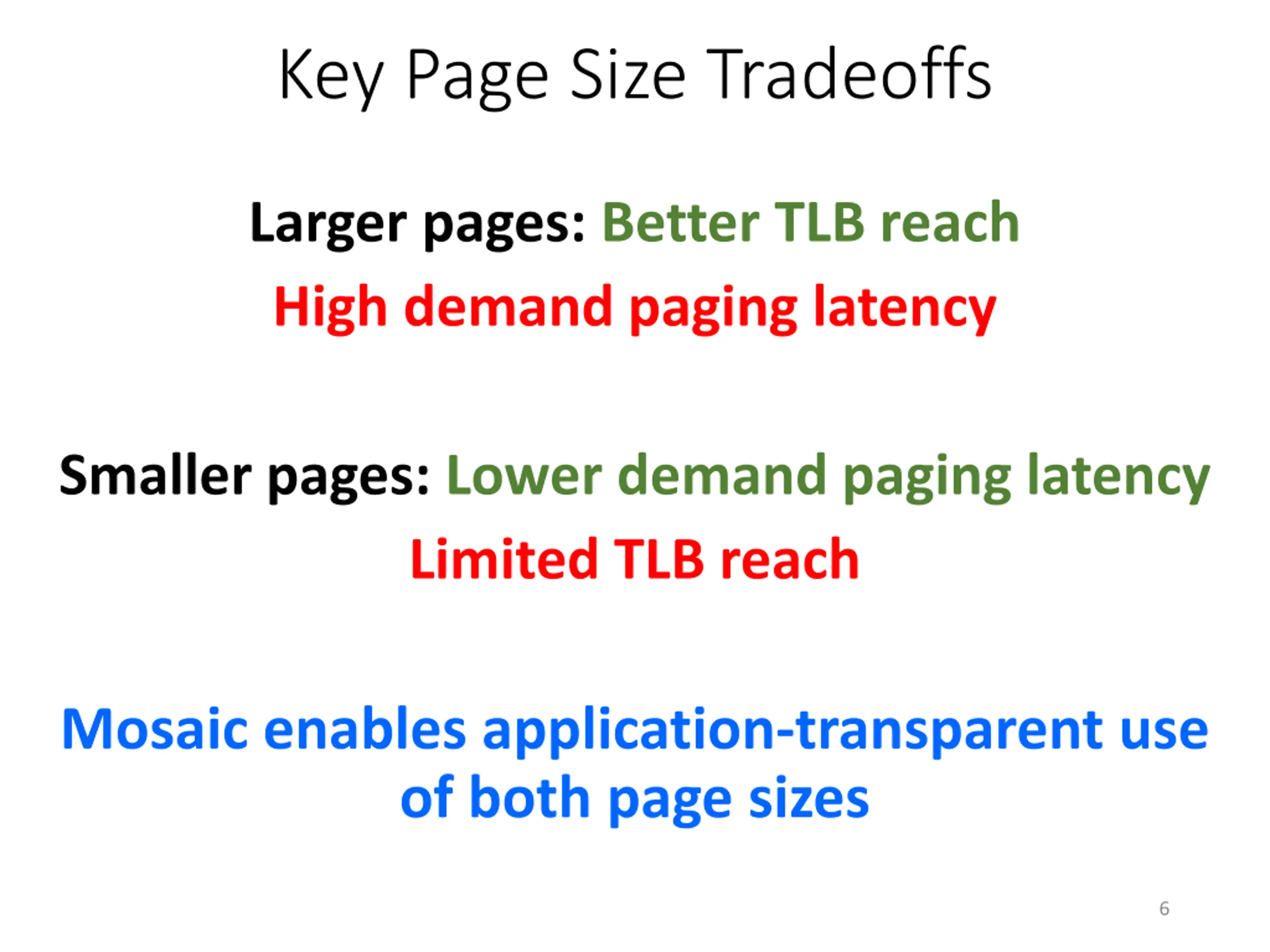 Key Page Size Tradeoffs Larger pages: Better TLB reach High demand paging latency Smaller pages: Lower demand paging latency Limited TLB reach Mosaic enables application-transparent use of both page sizes 6