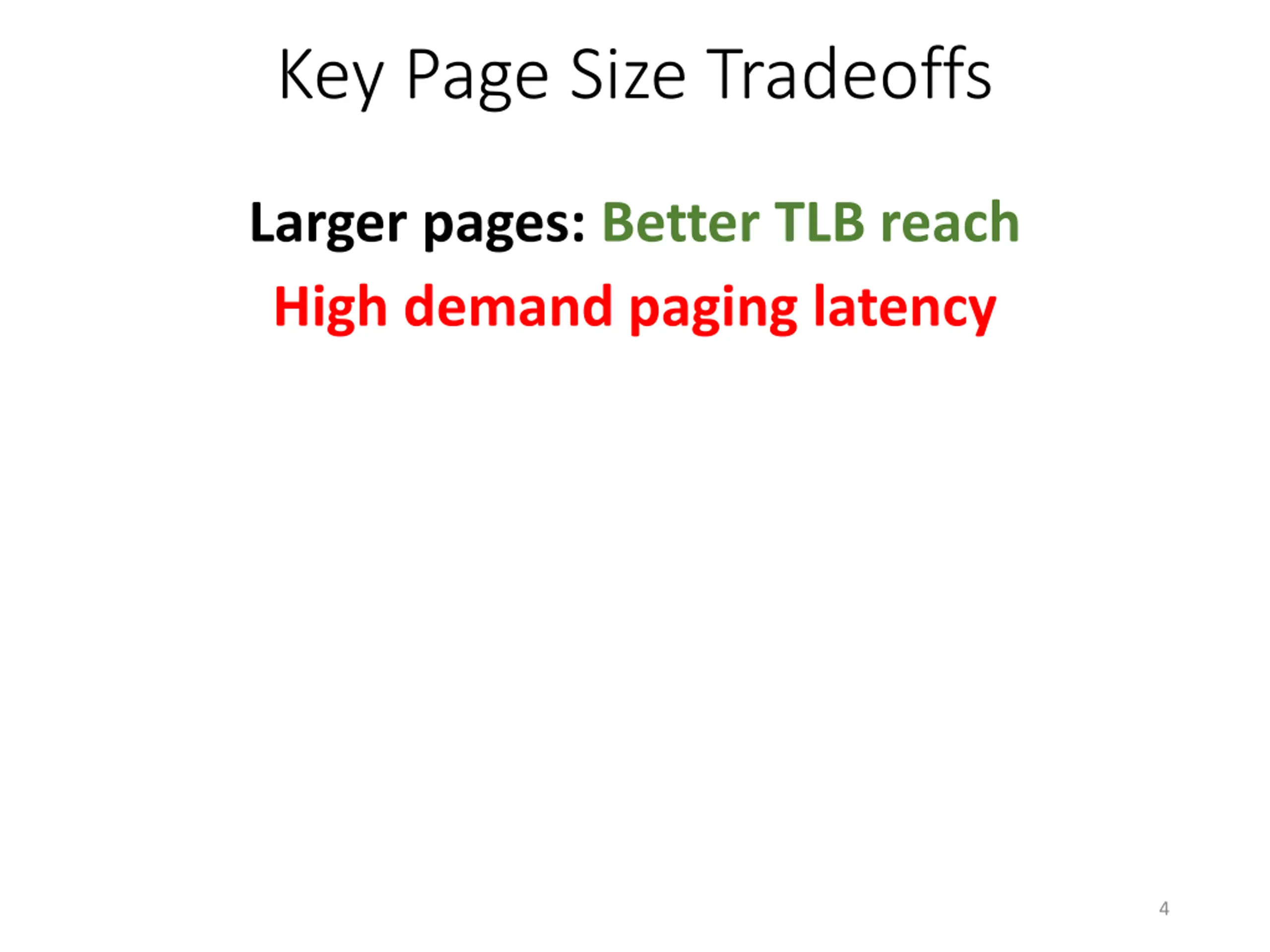 Key Page Size Tradeoffs Larger pages: Better TLB reach High demand paging latency 4