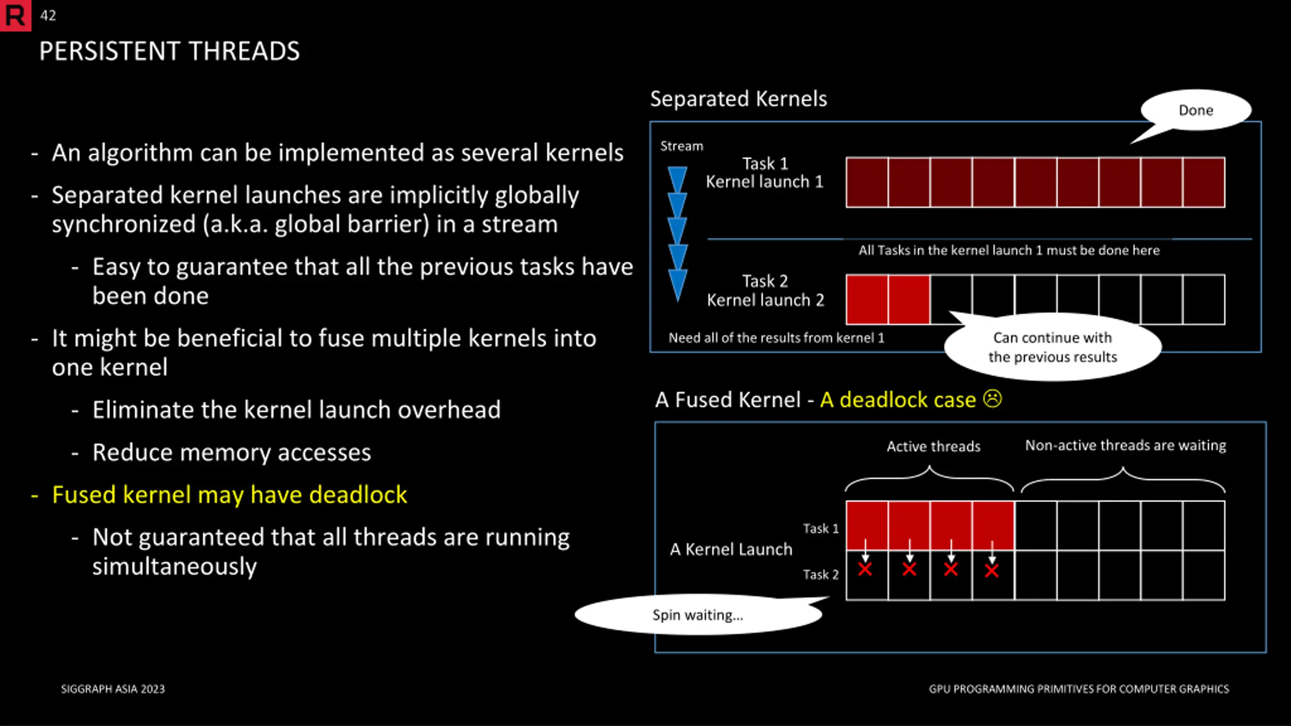 42 PERSISTENT THREADS Separated Kernels Done Stream - An algorithm can be implemented as several kernels Task 1 Kernel launch 1 - Separated kernel launches are implicitly globally synchronized (a.k.a. global barrier) in a stream All Tasks in the kernel launch 1 must be done here - Easy to guarantee that all the previous tasks have been done Task 2 Kernel launch 2 - It might be beneficial to fuse multiple kernels into one kernel Can continue with the previous results Need all of the results from kernel 1 A Fused Kernel - A deadlock case - Eliminate the kernel launch overhead Non-active threads are waiting Active threads - Reduce memory accesses - Fused kernel may have deadlock Task 1 - Not guaranteed that all threads are running simultaneously A Kernel Launch Task 2 Spin waiting SIGGRAPH ASIA 2023 GPU PROGRAMMING PRIMITIVES FOR COMPUTER GRAPHICS