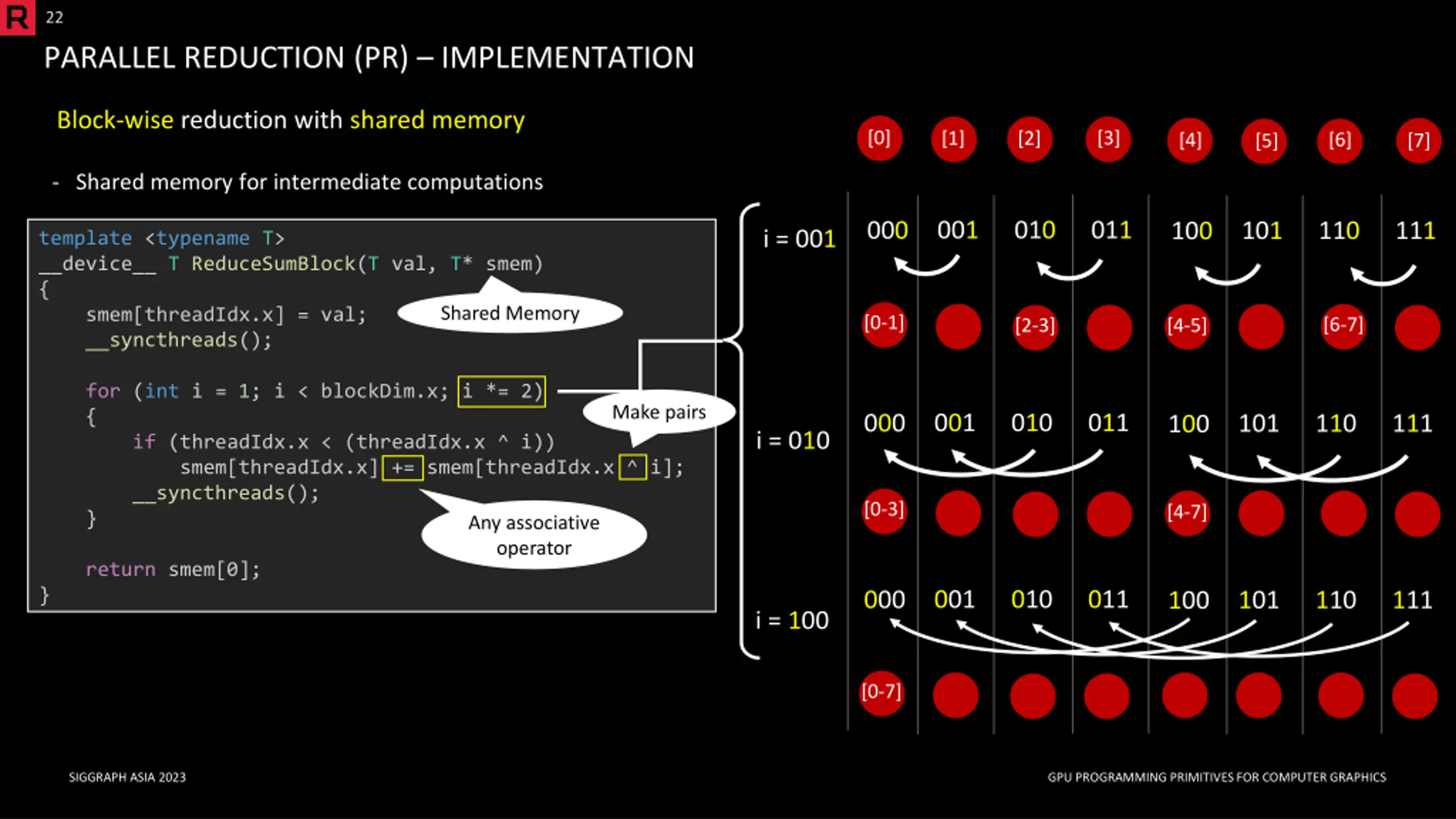 23 PARALLEL REDUCTION (PR) IMPLEMENTATION Warp-wise reduction with shuffle [0] [3] [2] [1] [6] [4] [7] [5] - Directly reading registers of other threads 001 010 011 000 101 110 111 100 i = 001 template <typename T> __device__ T ReduceSumWarp(T val) { for (int i = 1; i < warpSize; i *= 2) { val += __shfl_xor(val, i); } return val; } __shfl(val, laneIndex ^ i) [0-1] [0-1] [4-5] [6-7] [6-7] [2-3] [4-5] [2-3] 001 010 011 000 101 110 111 100 i = 010 [0-3] [0-3] [4-7] [4-7] [4-7] [0-3] [4-7] [0-3] 001 010 011 000 101 110 111 100 i = 100 [0-7] [0-7] [0-7] [0-7] [0-7] [0-7] [0-7] [0-7] SIGGRAPH ASIA 2023 GPU PROGRAMMING PRIMITIVES FOR COMPUTER GRAPHICS