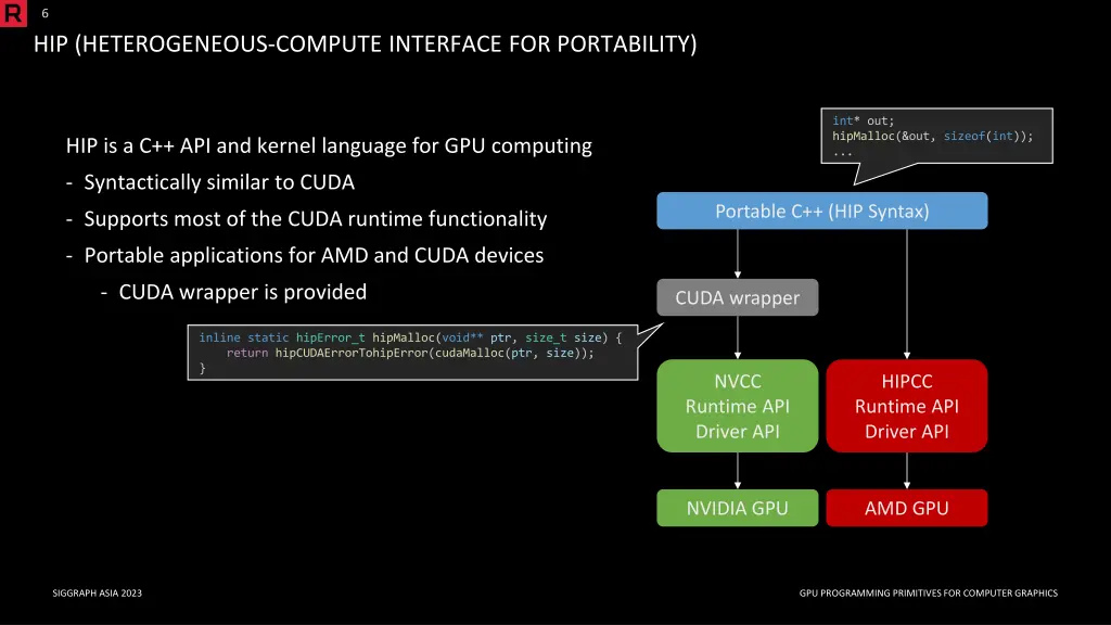 6 HIP (HETEROGENEOUS-COMPUTE INTERFACE FOR PORTABILITY) int* out; hipMalloc(&out, sizeof(int)); ... HIP is a C++ API and kernel language for GPU computing - Syntactically similar to CUDA Portable C++ (HIP Syntax) - Supports most of the CUDA runtime functionality - Portable applications for AMD and CUDA devices - CUDA wrapper is provided CUDA wrapper inline static hipError_t hipMalloc(void** ptr, size_t size) { return hipCUDAErrorTohipError(cudaMalloc(ptr, size)); } NVCC HIPCC Runtime API Driver API Runtime API Driver API NVIDIA GPU AMD GPU SIGGRAPH ASIA 2023 GPU PROGRAMMING PRIMITIVES FOR COMPUTER GRAPHICS