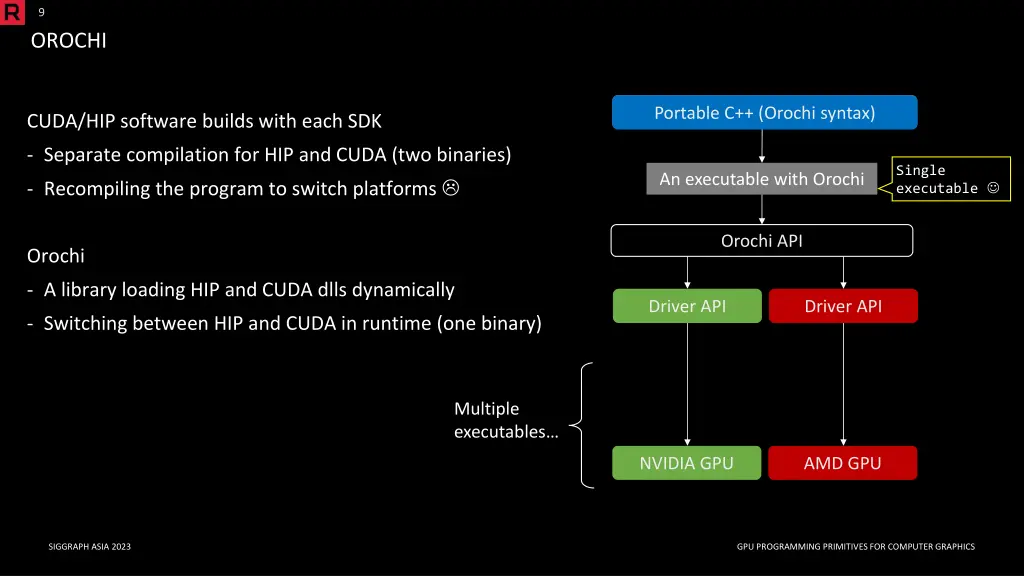 9 OROCHI Portable C++ ( HIP Syntax ) Portable C++ (Orochi syntax) CUDA/HIP software builds with each SDK - Separate compilation for HIP and CUDA (two binaries) - Recompiling the program to switch platforms Single executable An executable with Orochi CUDA Wrapper Orochi API Orochi NVCC HIPCC - A library loading HIP and CUDA dlls dynamically Runtime API Driver API Driver API Runtime API Driver API Driver API - Switching between HIP and CUDA in runtime (one binary) An executable with CUDA SDK An executable with HIP SDK Multiple executables NVIDIA GPU AMD GPU SIGGRAPH ASIA 2023 GPU PROGRAMMING PRIMITIVES FOR COMPUTER GRAPHICS
