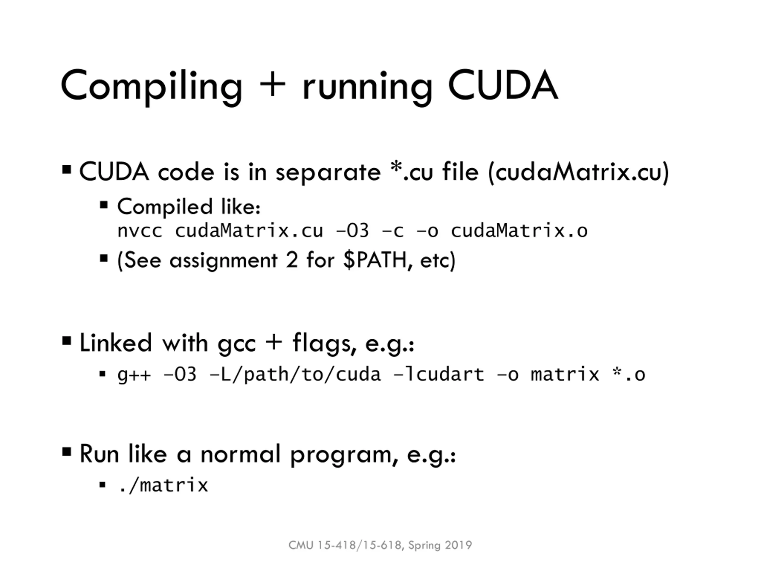 Compiling + running CUDA CUDA code is in separate *.cu file (cudaMatrix.cu) Compiled like: nvcc cudaMatrix.cu O3 c o cudaMatrix.o (See assignment 2 for $PATH, etc) Linked with gcc + flags, e.g.: g++ O3 L/path/to/cuda lcudart o matrix *.o Run like a normal program, e.g.: ./matrix CMU 15-418/15-618, Spring 2019
