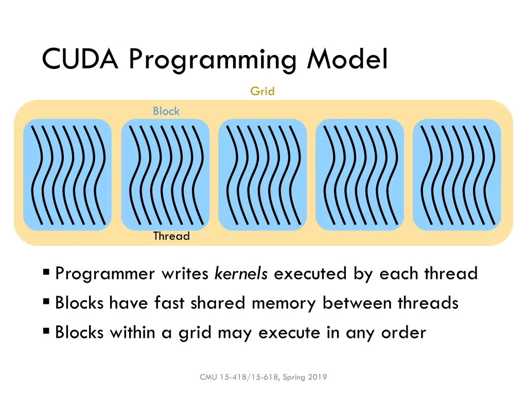 CUDA Programming Model Grid Block Thread Programmer writes kernels executed by each thread Blocks have fast shared memory between threads Blocks within a grid may execute in any order CMU 15-418/15-618, Spring 2019