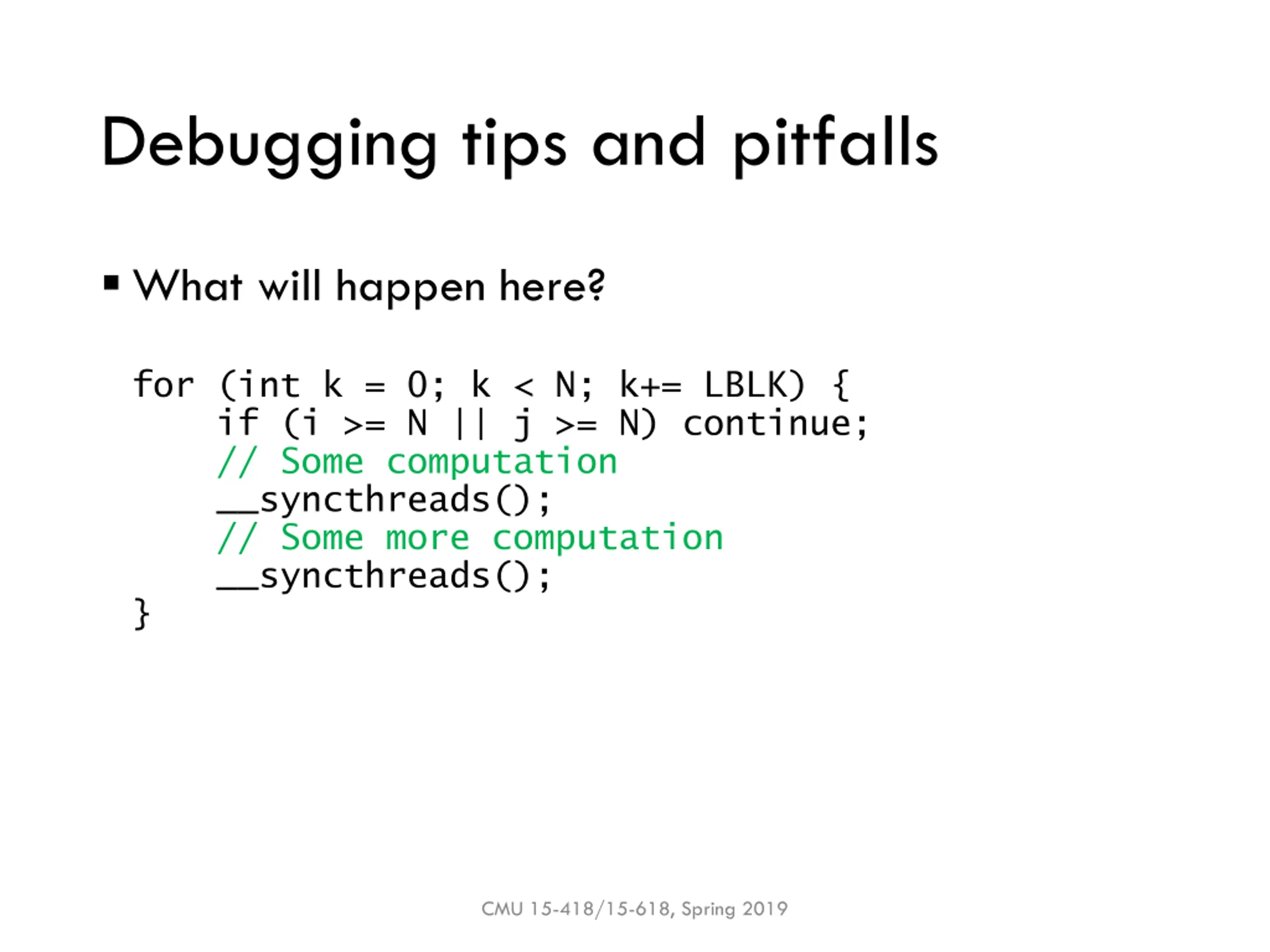 Debugging tips and pitfalls What will happen here? for (int k = 0; k < N; k+= LBLK) { if (i >= N || j >= N) continue; // Some computation __syncthreads(); // Some more computation __syncthreads(); } CMU 15-418/15-618, Spring 2019