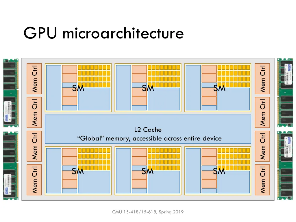GPU microarchitecture Mem Ctrl Mem Ctrl SM SM SM Mem Ctrl Mem Ctrl L2 Cache Mem Ctrl Mem Ctrl Global memory, accessible across entire device SM SM SM Mem Ctrl Mem Ctrl CMU 15-418/15-618, Spring 2019