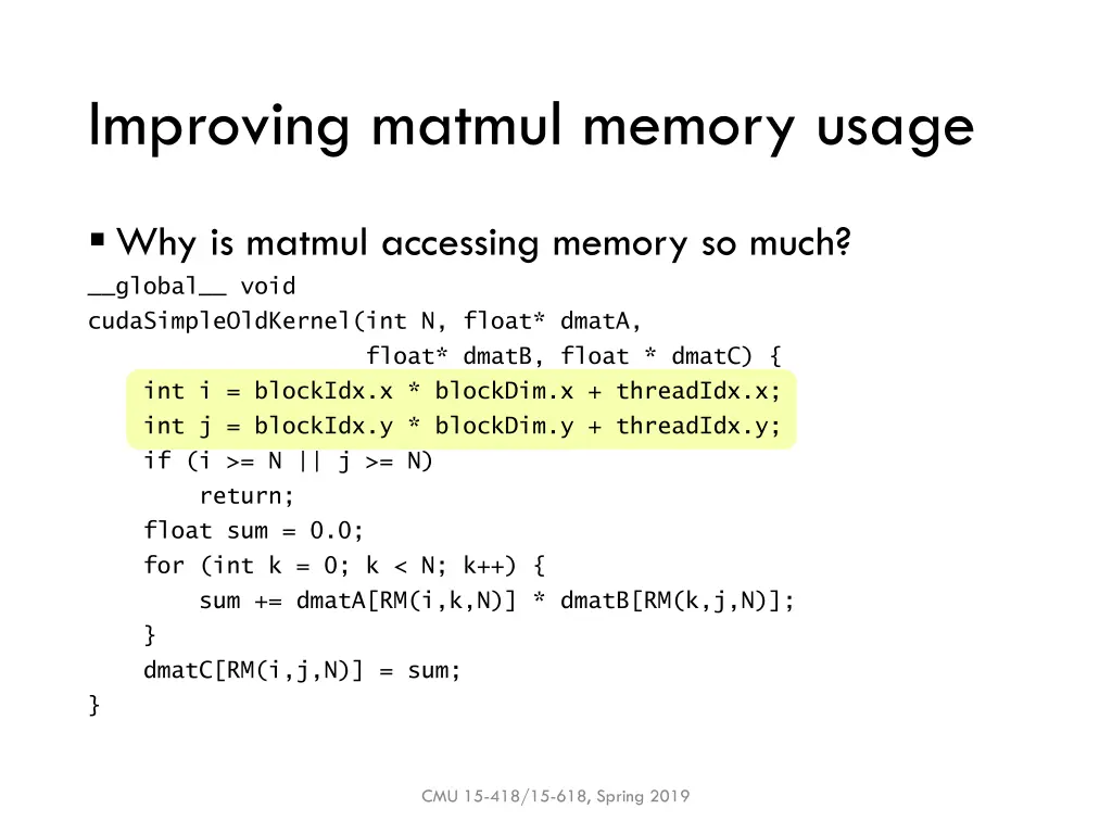Improving matmul memory usage Why is matmul accessing memory so much? __global__ void cudaSimpleOldKernel(int N, float* dmatA, float* dmatB, float * dmatC) { int i = blockIdx.x * blockDim.x + threadIdx.x; int j = blockIdx.y * blockDim.y + threadIdx.y; if (i >= N || j >= N) return; float sum = 0.0; for (int k = 0; k < N; k++) { sum += dmatA[RM(i,k,N)] * dmatB[RM(k,j,N)]; } dmatC[RM(i,j,N)] = sum; } CMU 15-418/15-618, Spring 2019