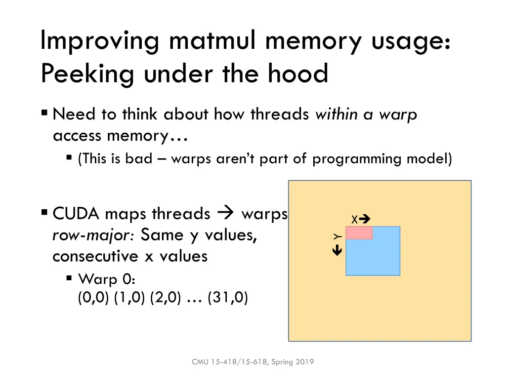 Improving matmul memory usage: Peeking under the hood Need to think about how threads within a warp access memory (This is bad warps aren t part of programming model) CUDA maps threads warps row-major: Same y values, consecutive x values Warp 0: (0,0) (1,0) (2,0) (31,0) X Y CMU 15-418/15-618, Spring 2019