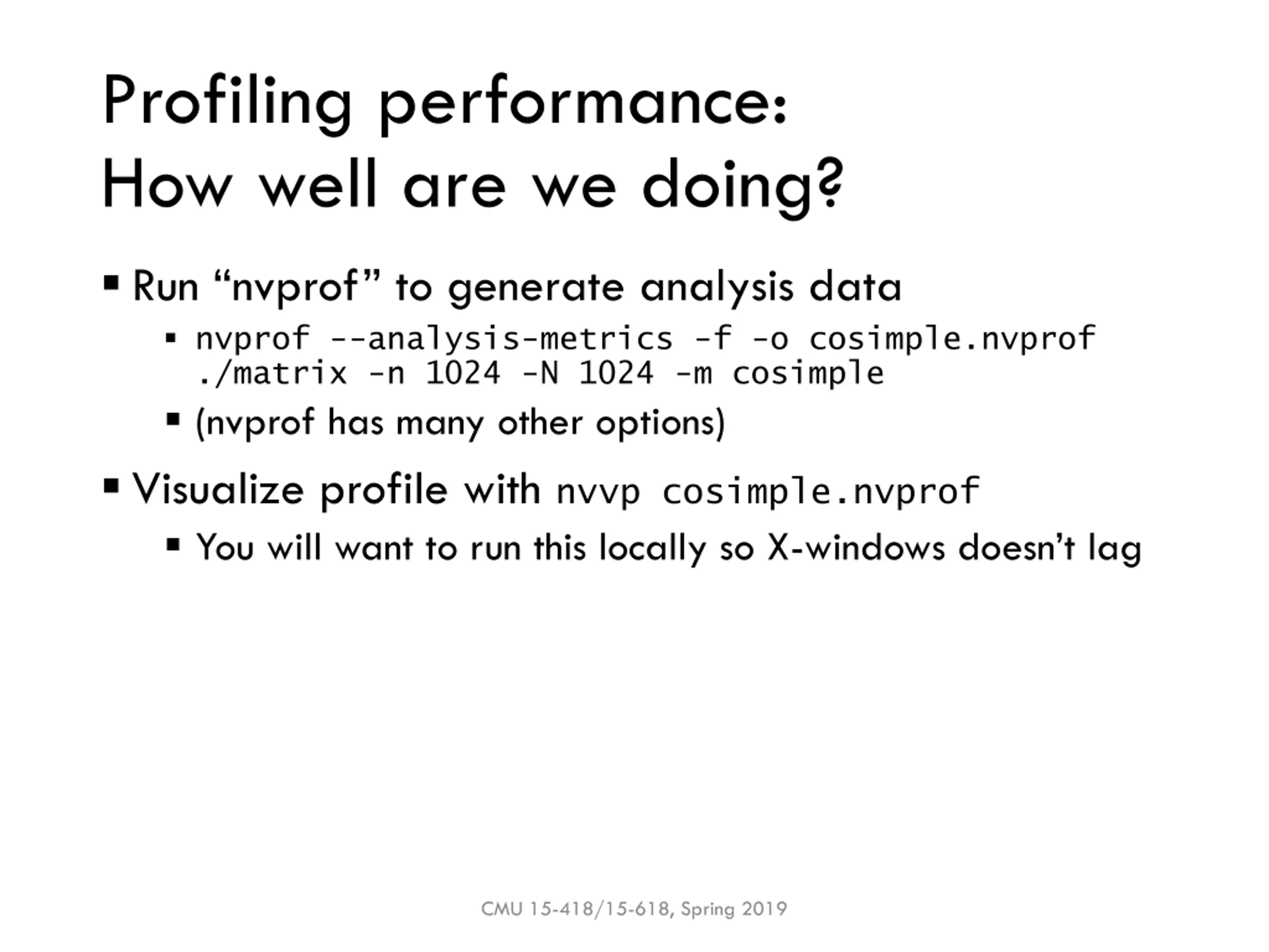 Profiling performance: How well are we doing? Run nvprof to generate analysis data nvprof --analysis-metrics -f -o cosimple.nvprof ./matrix -n 1024 -N 1024 -m cosimple (nvprof has many other options) Visualize profile with nvvp cosimple.nvprof You will want to run this locally so X-windows doesn t lag CMU 15-418/15-618, Spring 2019