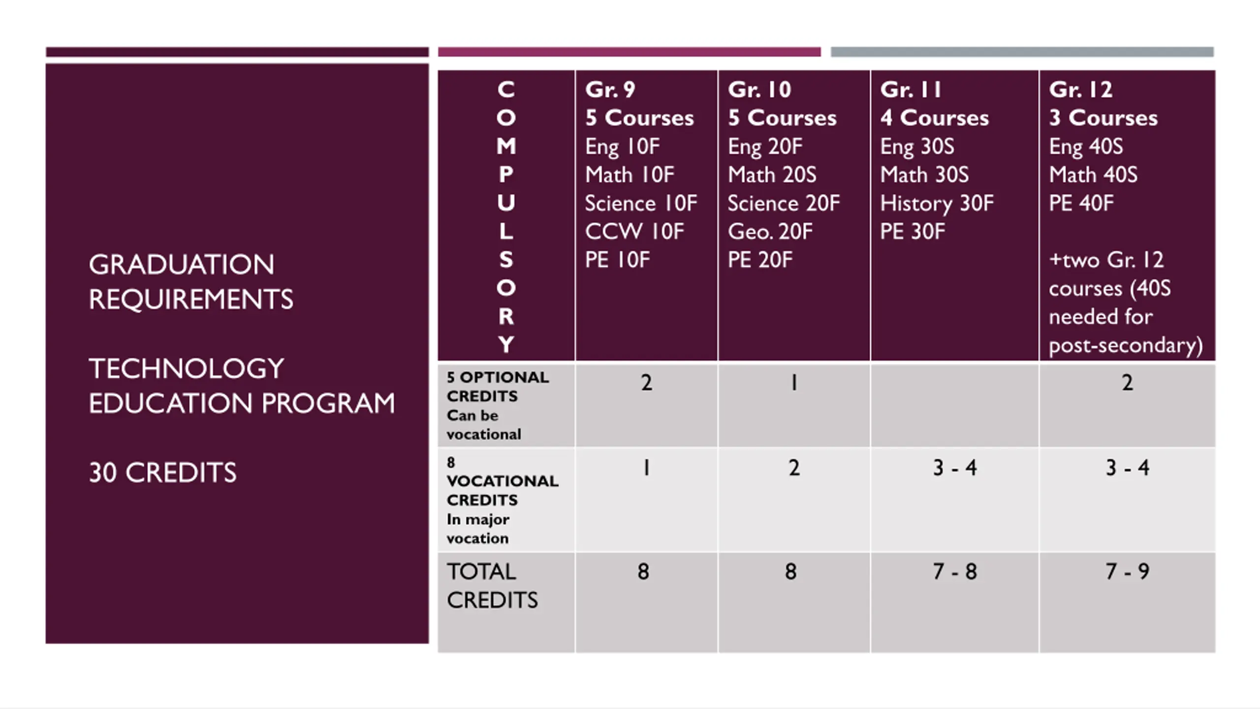 C O M P U L S O R Y Gr. 9 5 Courses Eng 10F Math 10F Science 10F CCW 10F PE 10F Gr. 10 5 Courses Eng 20F Math 20S Science 20F Geo. 20F PE 20F Gr. 11 4 Courses Eng 30S Math 30S History 30F PE 30F Gr. 12 3 Courses Eng 40S Math 40S PE 40F +two Gr. 12 courses (40S needed for post-secondary) 2 GRADUATION REQUIREMENTS TECHNOLOGY EDUCATION PROGRAM 5 OPTIONAL CREDITS Can be vocational 2 1 8 VOCATIONAL CREDITS In major vocation TOTAL CREDITS 1 2 3 - 4 3 - 4 30 CREDITS 7 - 8 7 - 9 8 8