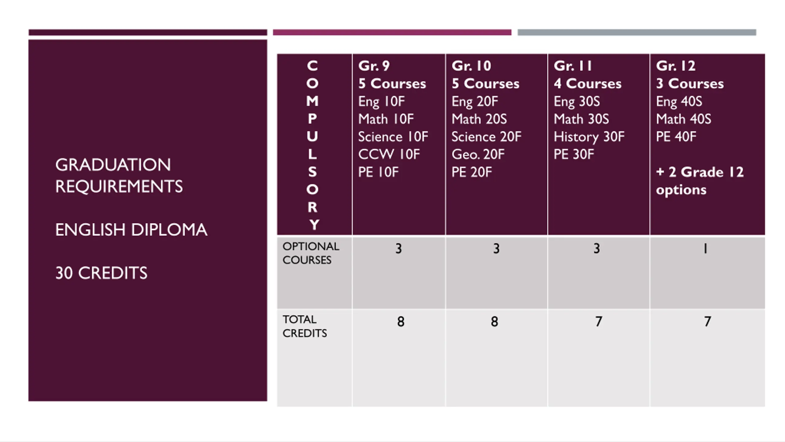 C O M P U L S O R Y Gr. 9 5 Courses Eng 10F Math 10F Science 10F CCW 10F PE 10F Gr. 10 5 Courses Eng 20F Math 20S Science 20F Geo. 20F PE 20F Gr. 11 4 Courses Eng 30S Math 30S History 30F PE 30F Gr. 12 3 Courses Eng 40S Math 40S PE 40F GRADUATION REQUIREMENTS + 2 Grade 12 options ENGLISH DIPLOMA OPTIONAL COURSES 3 3 3 1 30 CREDITS TOTAL CREDITS 7 7 8 8
