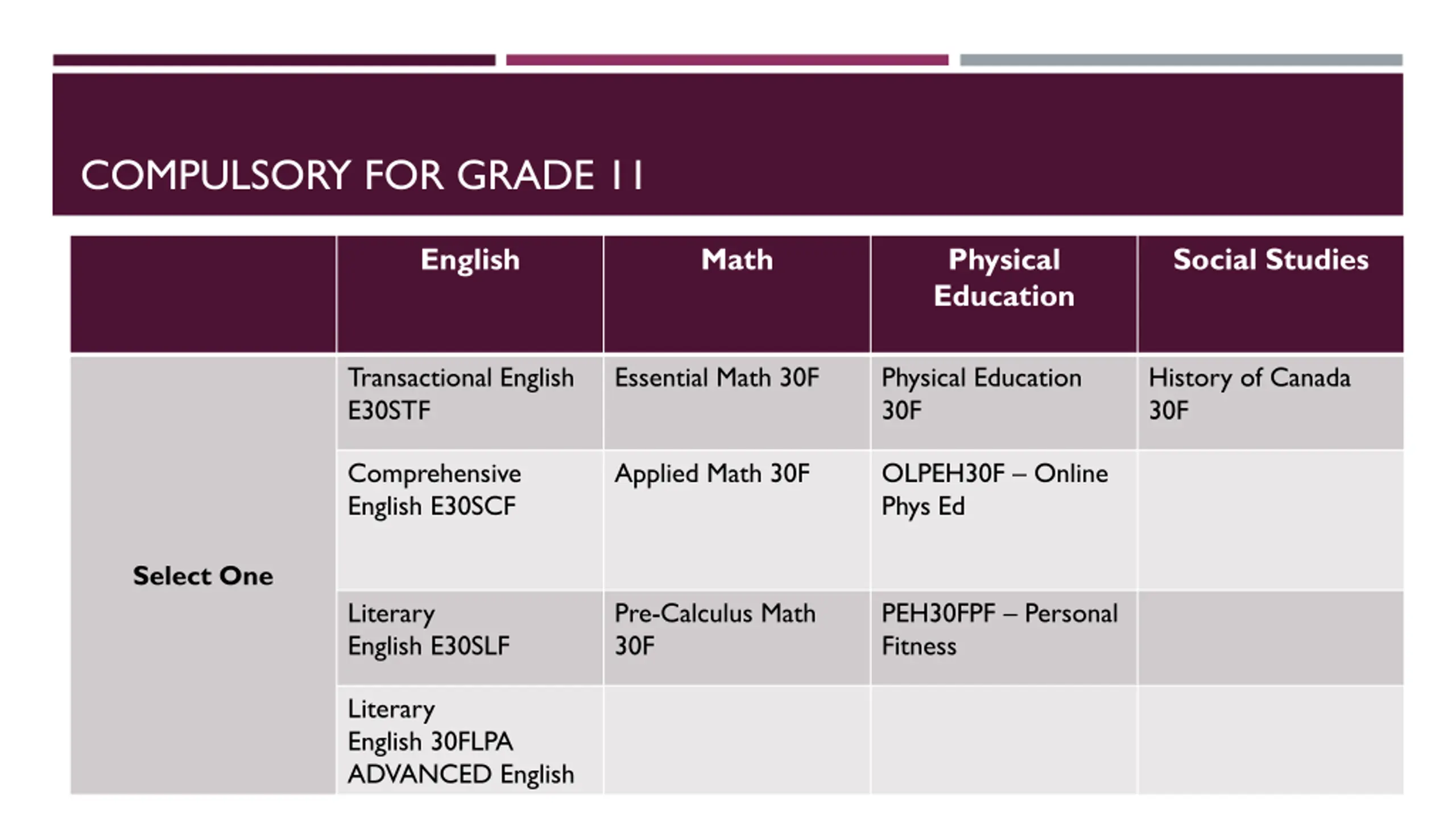 COMPULSORY FOR GRADE 11 English Math Physical Education Social Studies Transactional English E30STF Essential Math 30F Physical Education 30F History of Canada 30F Comprehensive English E30SCF Applied Math 30F OLPEH30F Online Phys Ed Select One Literary English E30SLF Pre-Calculus Math 30F PEH30FPF Personal Fitness Literary English 30FLPA ADVANCED English