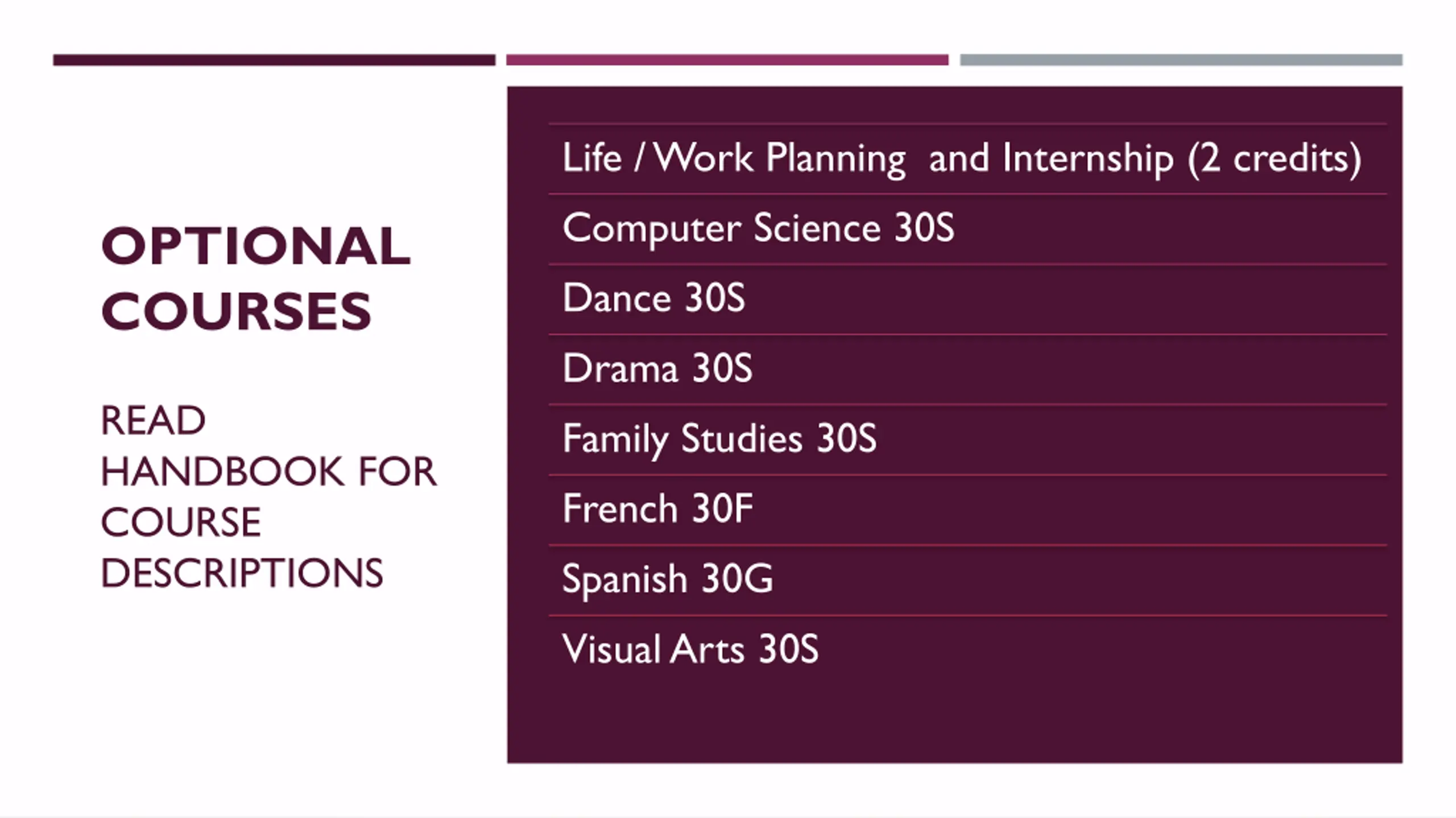 Life / Work Planning and Internship (2 credits) Computer Science 30S Dance 30S Drama 30S Family Studies 30S French 30F Spanish 30G Visual Arts 30S OPTIONAL COURSES READ HANDBOOK FOR COURSE DESCRIPTIONS