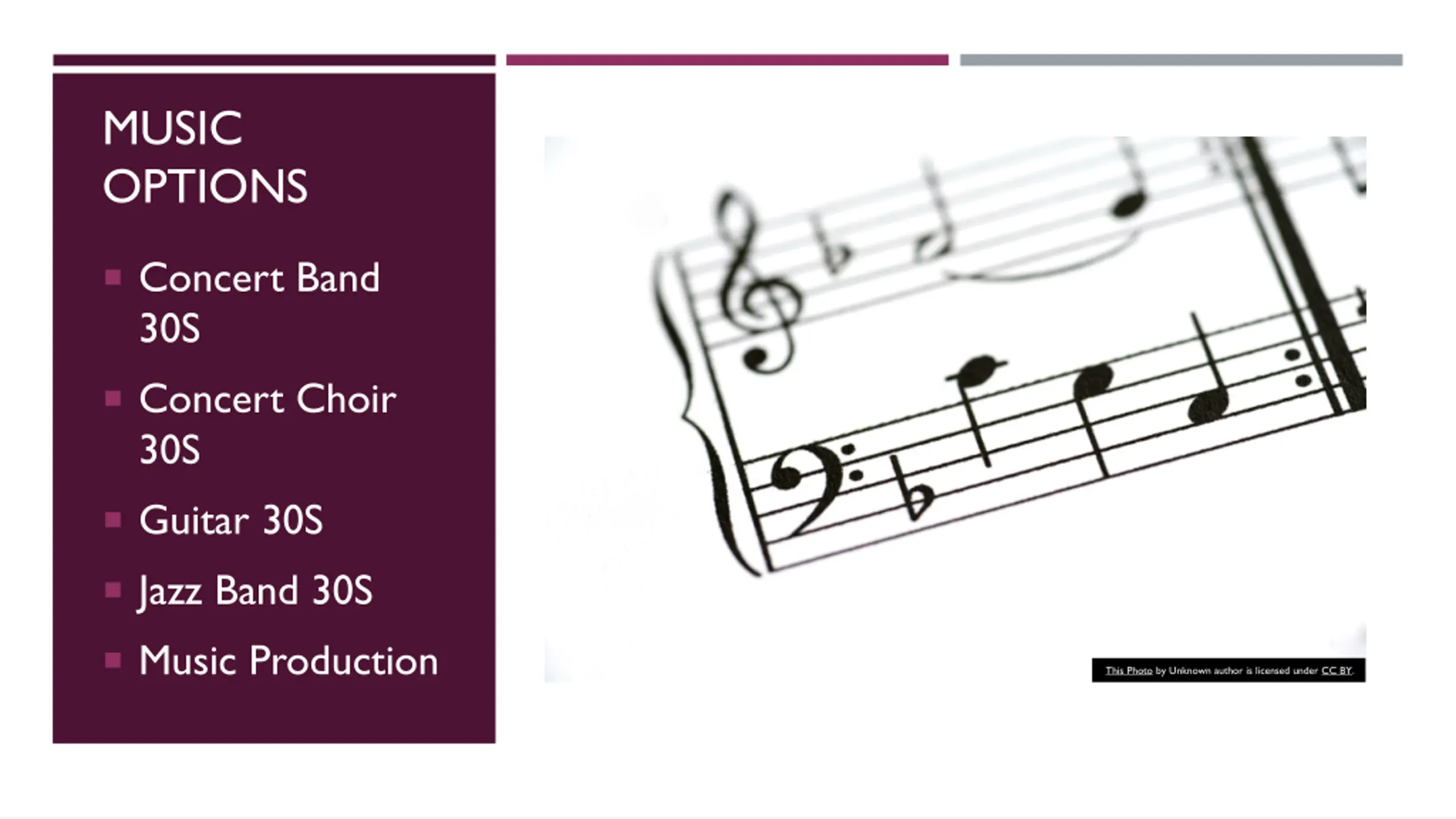 MUSIC OPTIONS Concert Band 30S Concert Choir 30S Guitar 30S Jazz Band 30S Music Production This Photo by Unknown author is licensed under CC BY.