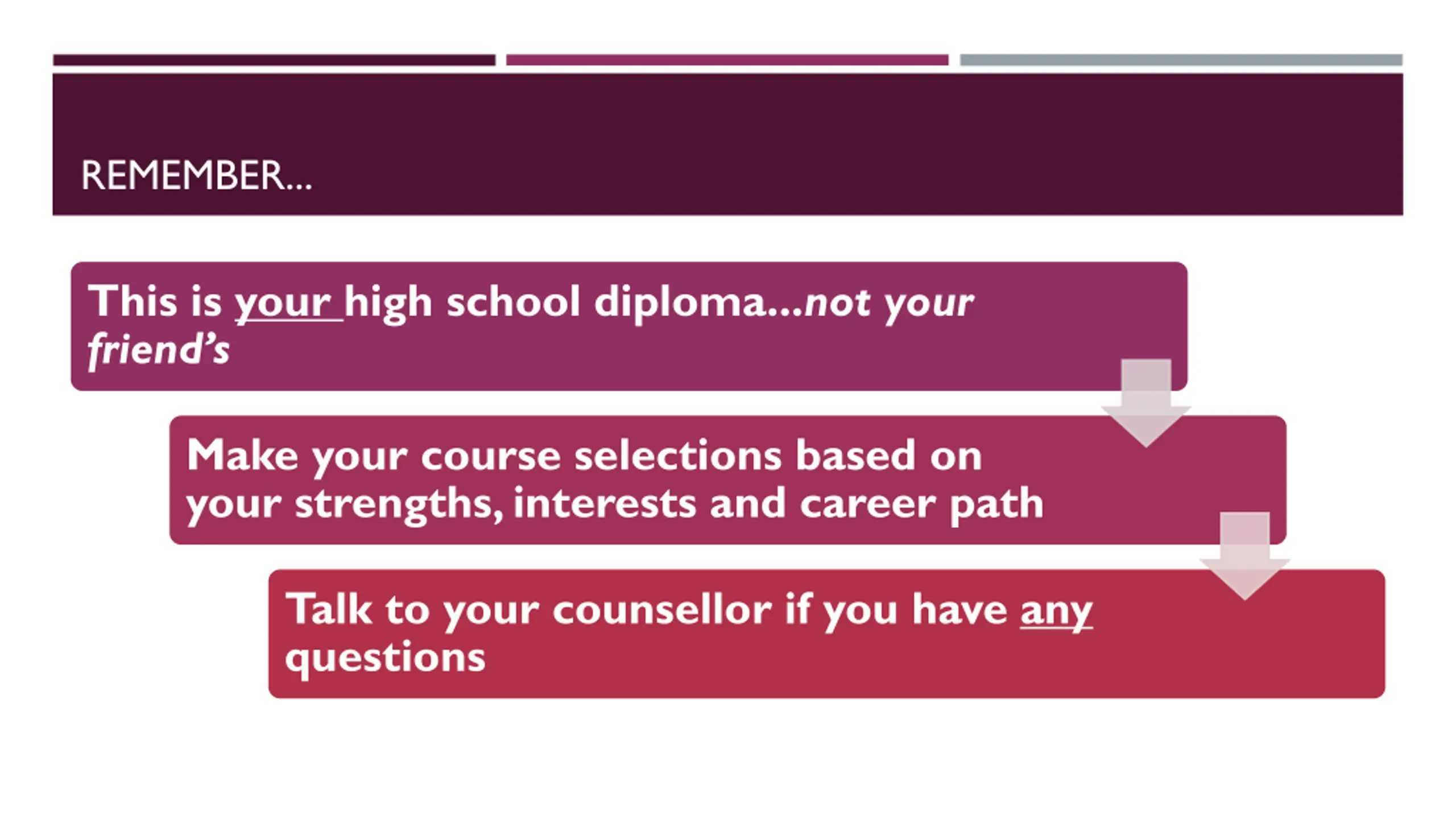 REMEMBER... This is your high school diploma...not your friend s Make your course selections based on your strengths, interests and career path Talk to your counsellor if you have any questions