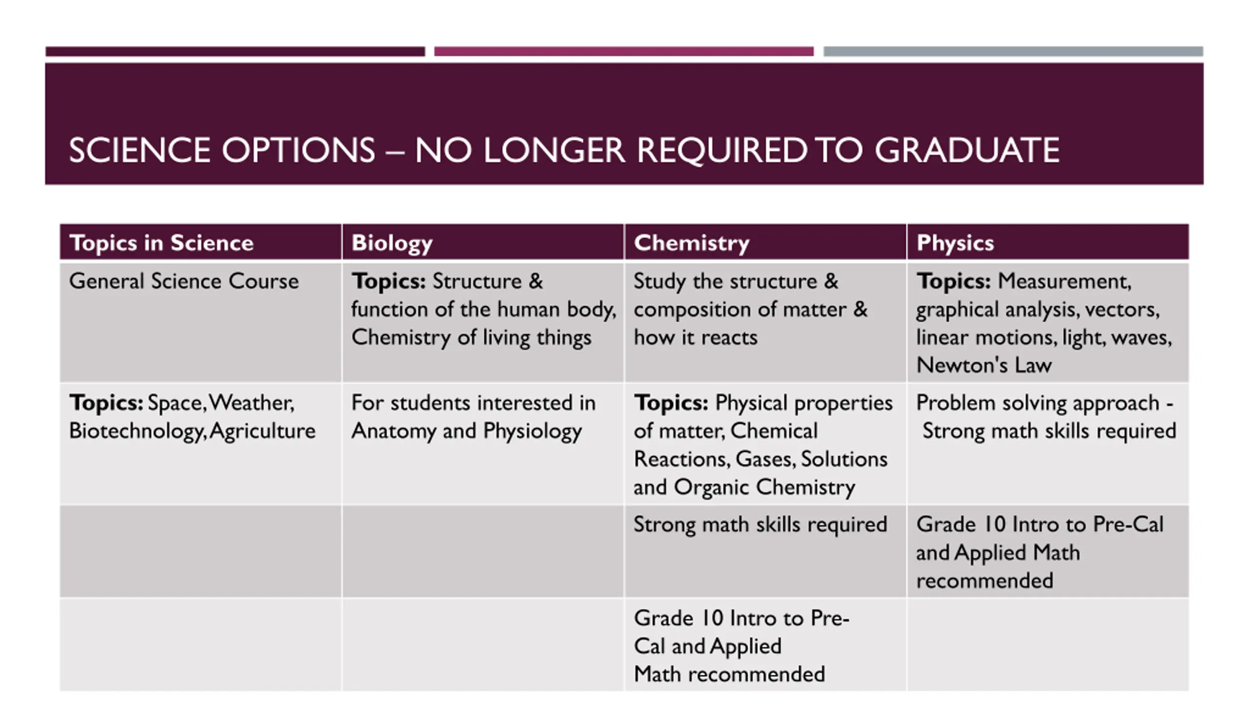SCIENCE OPTIONS NO LONGER REQUIRED TO GRADUATE Topics in Science General Science Course Biology Topics: Structure & function of the human body, Chemistry of living things Chemistry Study the structure & composition of matter & how it reacts Physics Topics: Measurement, graphical analysis, vectors, linear motions, light, waves, Newton's Law Problem solving approach - Strong math skills required Topics: Space, Weather, Biotechnology, Agriculture For students interested in Anatomy and Physiology Topics: Physical properties of matter, Chemical Reactions, Gases, Solutions and Organic Chemistry Strong math skills required Grade 10 Intro to Pre-Cal and Applied Math recommended Grade 10 Intro to Pre- Cal and Applied Math recommended