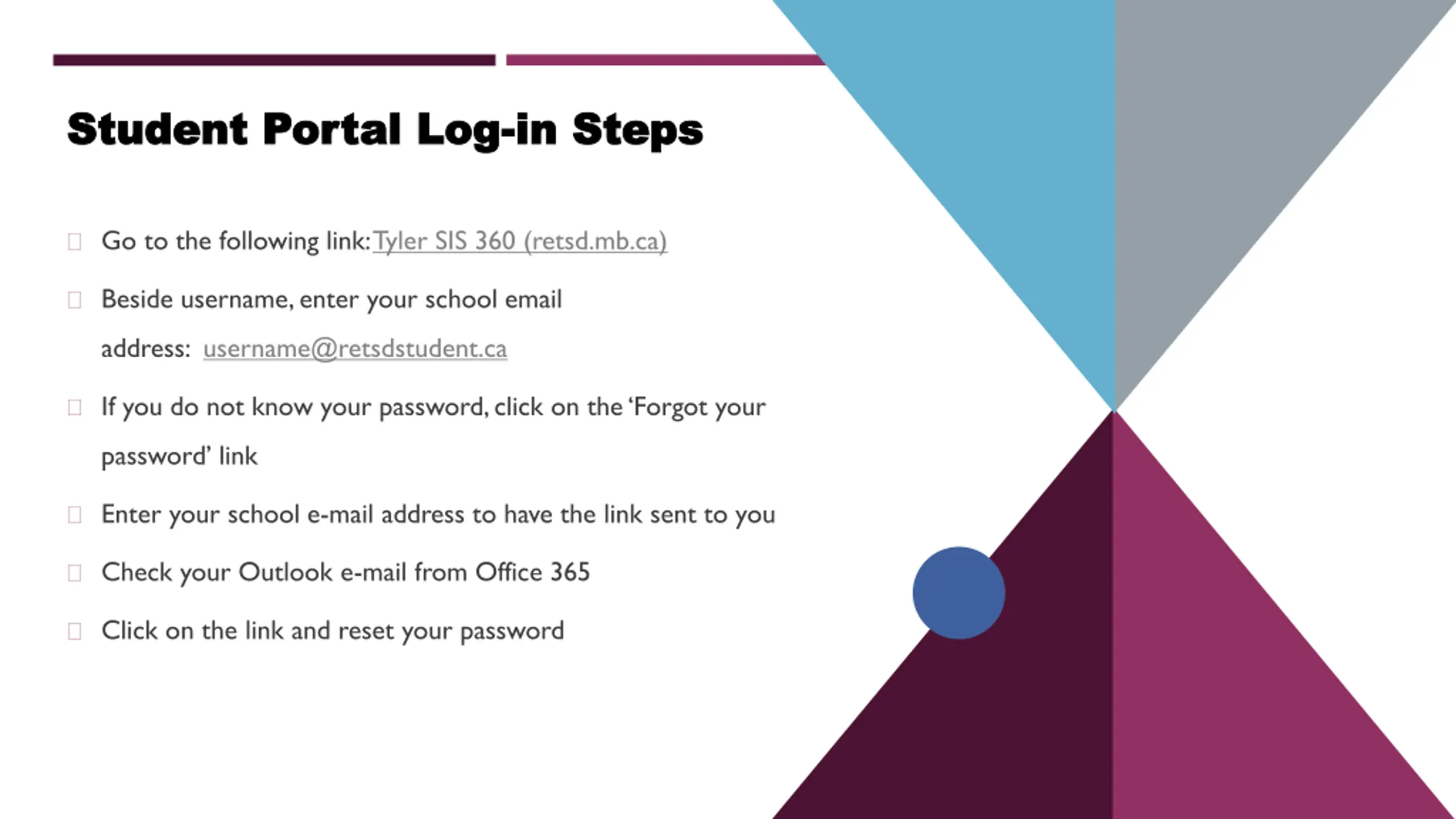 Student Portal Log Student Portal Log- -in Steps in Steps Go to the following link:Tyler SIS 360 (retsd.mb.ca) STSSS Beside username, enter your school email address: username@retsdstudent.ca If you do not know your password,click on the Forgot your password link Enter your school e-mail address to have the link sent to you Check your Outlook e-mail from Office 365 Click on the link and reset your password