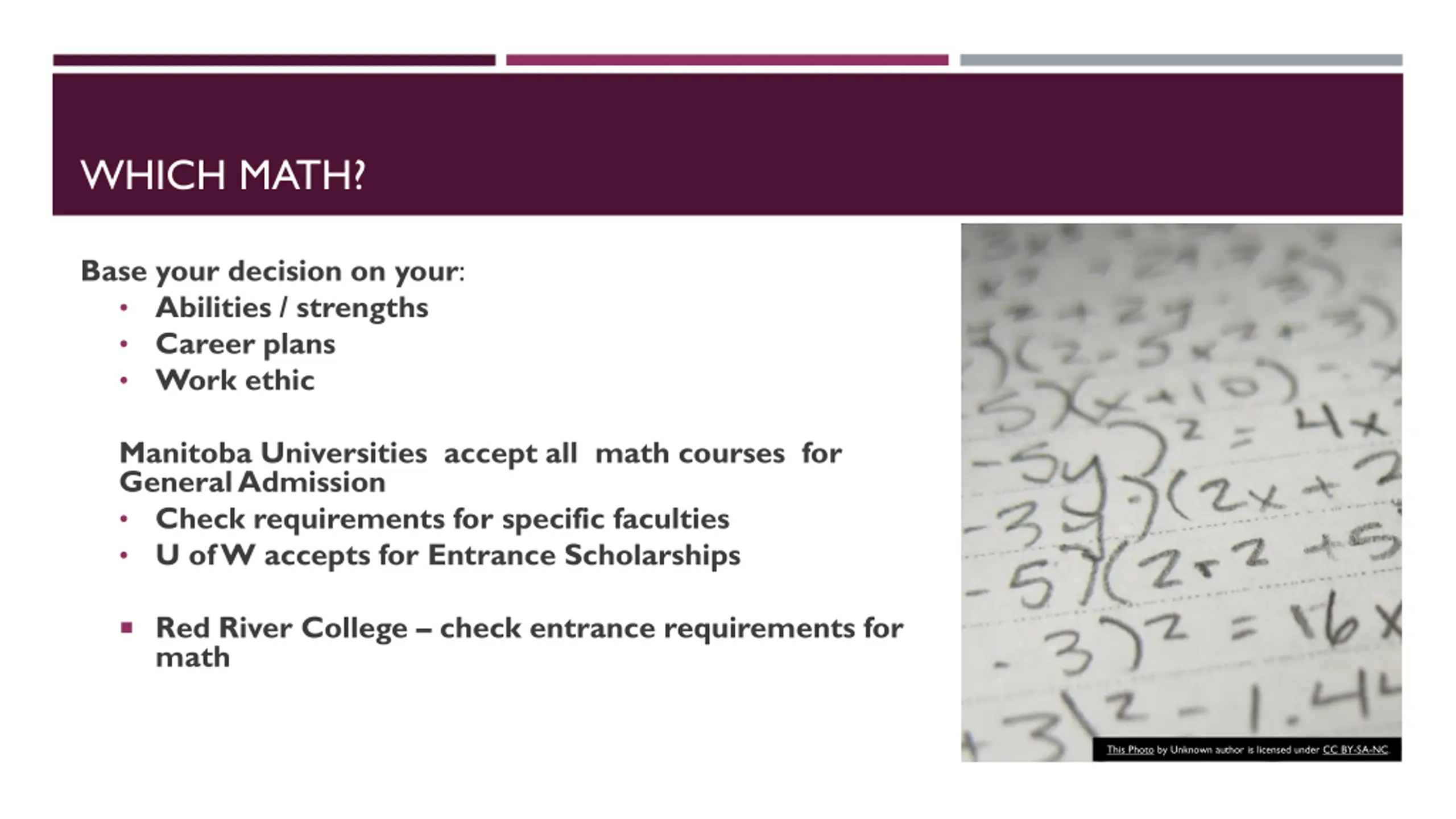 WHICH MATH? Base your decision on your: Abilities / strengths Career plans Work ethic Manitoba Universities accept all math courses for General Admission Check requirements for specific faculties U of W accepts for Entrance Scholarships Red River College check entrance requirements for math This Photo by Unknown author is licensed under CC BY-SA-NC.
