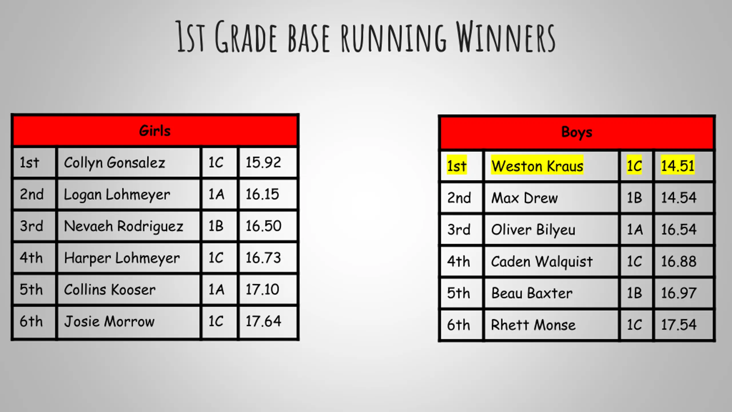 1st Grade base running Winners Girls Boys 1st Collyn Gonsalez 1C 15.92 1st Weston Kraus 1C 14.51 2nd Logan Lohmeyer 1A 16.15 2nd Max Drew 1B 14.54 3rd Nevaeh Rodriguez 1B 16.50 3rd Oliver Bilyeu 1A 16.54 4th Harper Lohmeyer 1C 16.73 4th Caden Walquist 1C 16.88 5th Collins Kooser 1A 17.10 5th Beau Baxter 1B 16.97 6th Josie Morrow 1C 17.64 6th Rhett Monse 1C 17.54