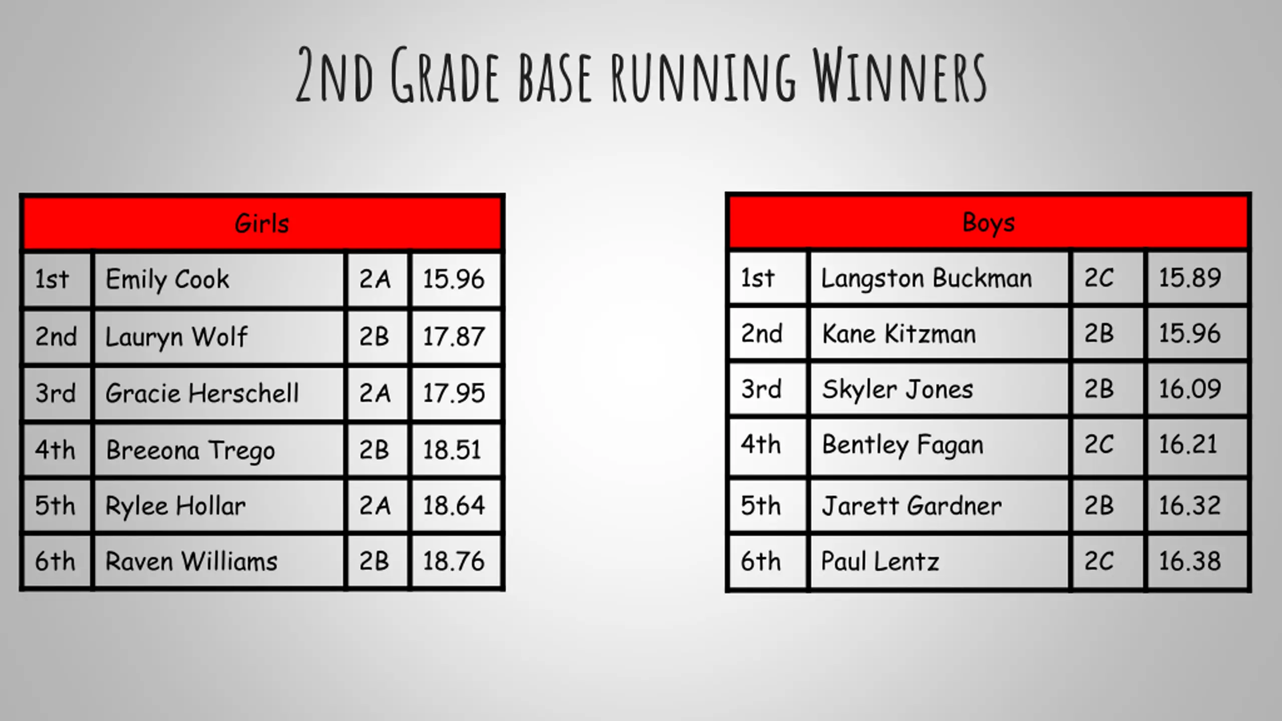 2nd Grade base running Winners Boys Girls 1st Langston Buckman 2C 15.89 1st Emily Cook 2A 15.96 2nd Kane Kitzman 2B 15.96 2nd Lauryn Wolf 2B 17.87 3rd Skyler Jones 2B 16.09 3rd Gracie Herschell 2A 17.95 4th Bentley Fagan 2C 16.21 4th Breeona Trego 2B 18.51 5th Jarett Gardner 2B 16.32 5th Rylee Hollar 2A 18.64 6th Paul Lentz 2C 16.38 6th Raven Williams 2B 18.76