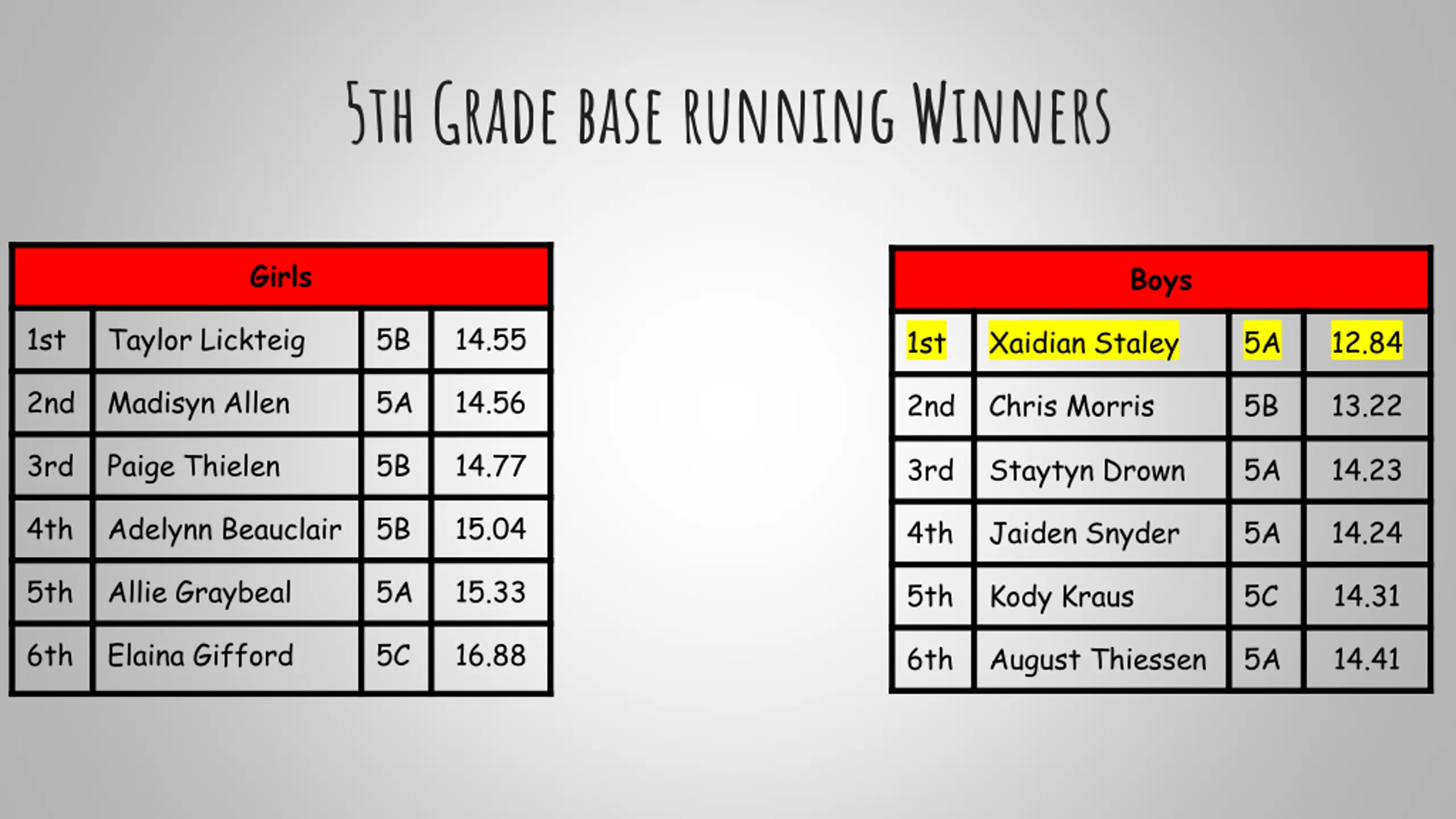 5th Grade base running Winners Girls Boys 1st Taylor Lickteig 5B 14.55 1st Xaidian Staley 5A 12.84 2nd Madisyn Allen 5A 14.56 2nd Chris Morris 5B 13.22 3rd Paige Thielen 5B 14.77 3rd Staytyn Drown 5A 14.23 4th Adelynn Beauclair 5B 15.04 4th Jaiden Snyder 5A 14.24 5th Allie Graybeal 5A 15.33 5th Kody Kraus 5C 14.31 6th Elaina Gifford 5C 16.88 6th August Thiessen 5A 14.41