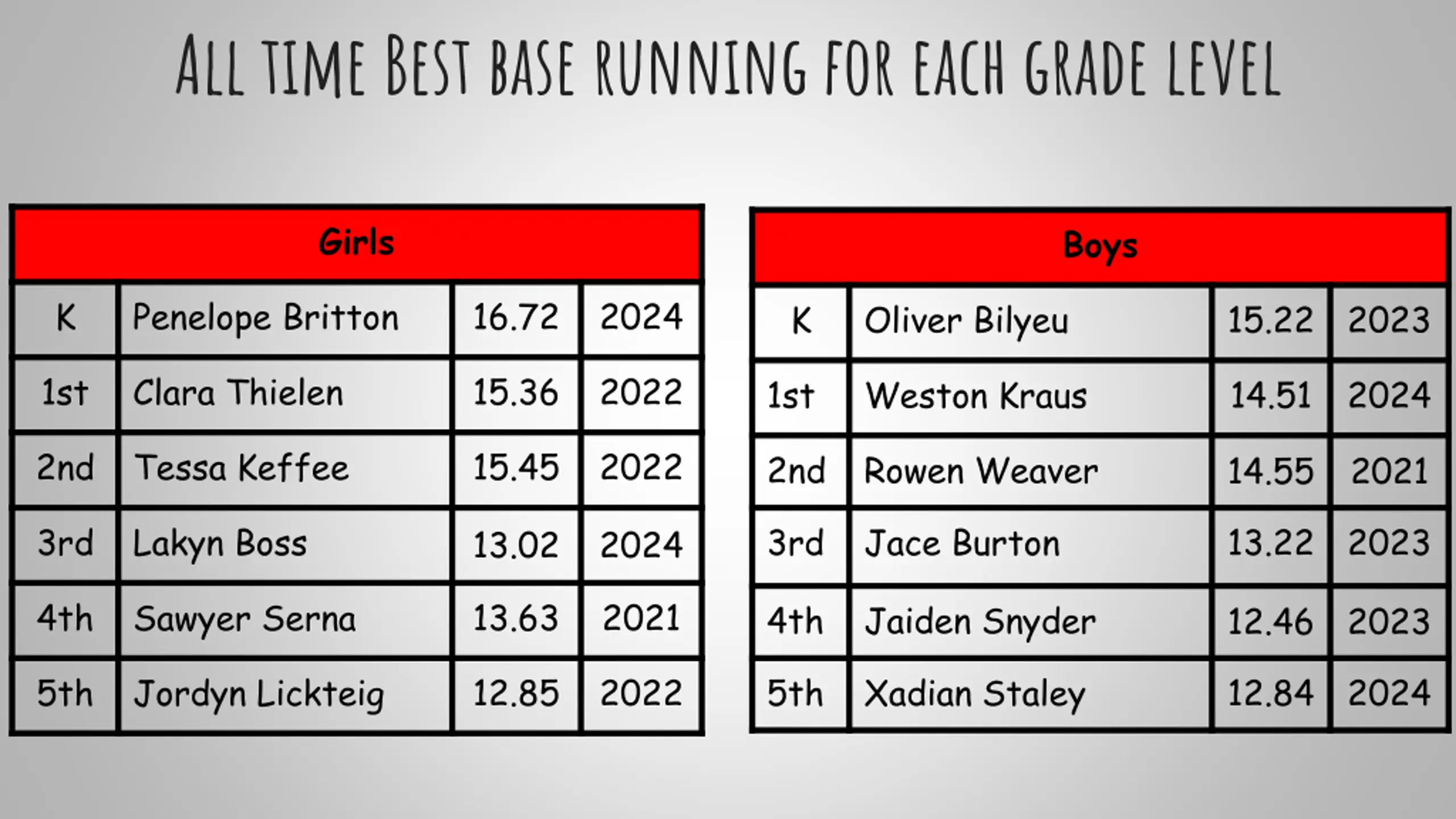 All time Best base running for each grade level Girls Boys K Penelope Britton 16.72 2024 K Oliver Bilyeu 15.22 2023 1st Clara Thielen 15.36 2022 1st Weston Kraus 14.51 2024 2nd Tessa Keffee 15.45 2022 2nd Rowen Weaver 14.55 2021 3rd Lakyn Boss 3rd Jace Burton 13.22 2023 13.02 2024 4th Sawyer Serna 13.63 2021 4th Jaiden Snyder 12.46 2023 5th Jordyn Lickteig 12.85 2022 5th Xadian Staley 12.84 2024