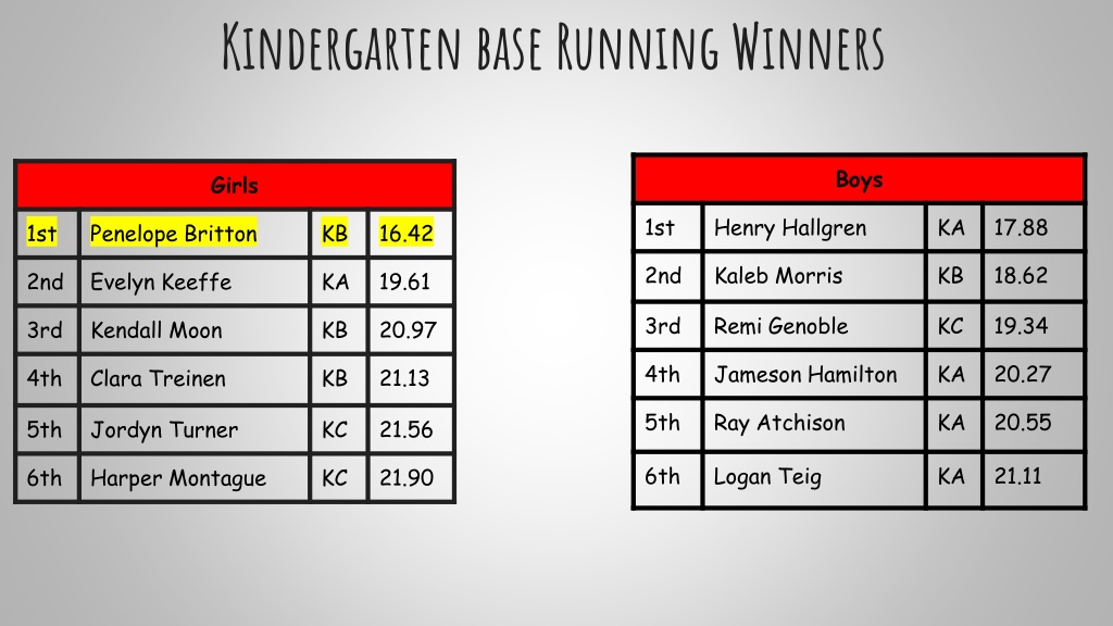 Kindergarten base Running Winners Boys Girls 1st Henry Hallgren KA 17.88 1st Penelope Britton KB 16.42 2nd Kaleb Morris KB 18.62 2nd Evelyn Keeffe KA 19.61 3rd Remi Genoble KC 19.34 3rd Kendall Moon KB 20.97 4th Jameson Hamilton KA 20.27 4th Clara Treinen KB 21.13 5th Ray Atchison KA 20.55 5th Jordyn Turner KC 21.56 6th Logan Teig KA 21.11 6th Harper Montague KC 21.90