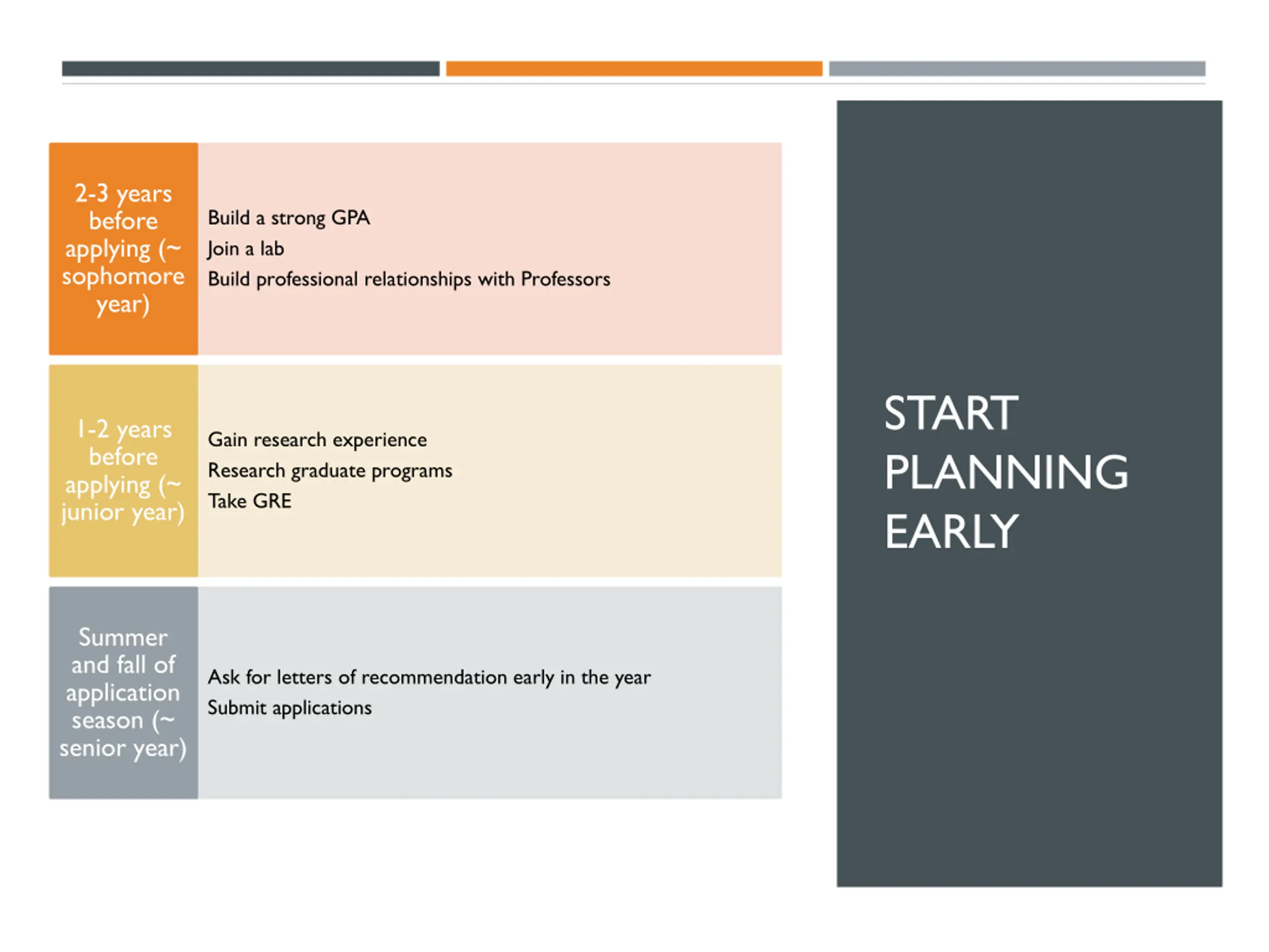 2-3 years before applying (~ sophomore year) Build a strong GPA Join a lab Build professional relationships with Professors START PLANNING EARLY 1-2 years before applying (~ junior year) Gain research experience Research graduate programs Take GRE Summer and fall of application season (~ senior year) Ask for letters of recommendation early in the year Submit applications