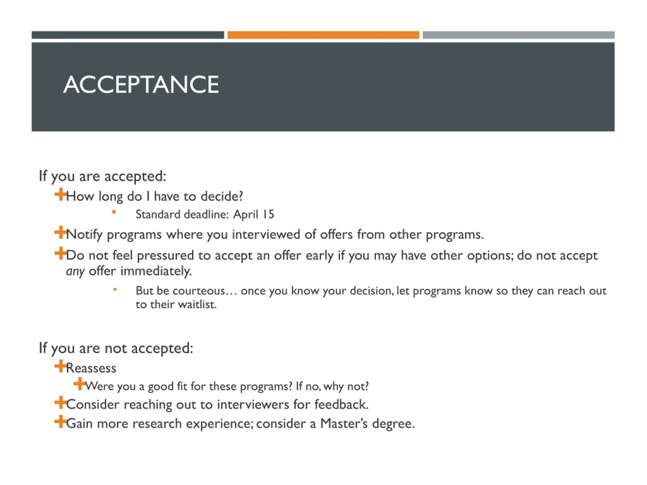 ACCEPTANCE If you are accepted: How long do I have to decide? Standard deadline: April 15 Notify programs where you interviewed of offers from other programs. Do not feel pressured to accept an offer early if you may have other options; do not accept any offer immediately. But be courteous once you know your decision, let programs know so they can reach out to their waitlist. If you are not accepted: Reassess Were you a good fit for these programs? If no, why not? Consider reaching out to interviewers for feedback. Gain more research experience; consider a Master s degree.