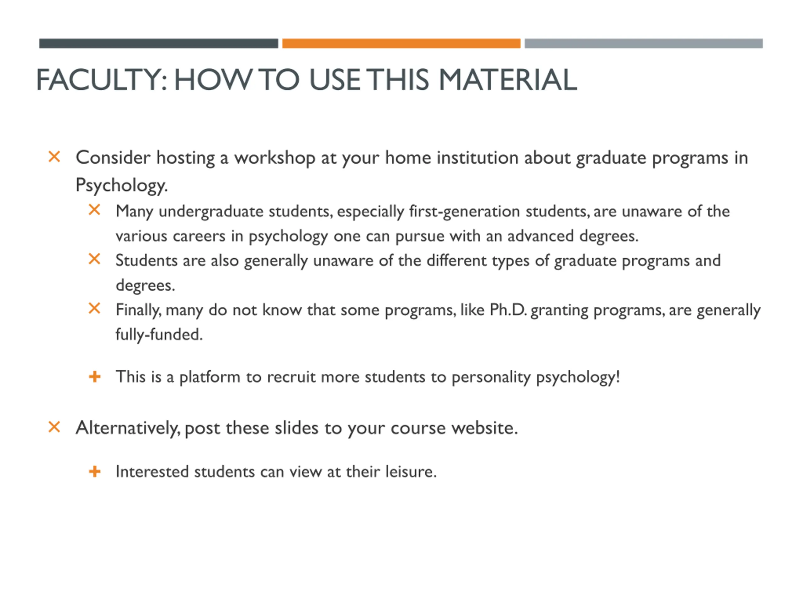 FACULTY: HOW TO USE THIS MATERIAL Consider hosting a workshop at your home institution about graduate programs in Psychology. Many undergraduate students, especially first-generation students, are unaware of the various careers in psychology one can pursue with an advanced degrees. Students are also generally unaware of the different types of graduate programs and degrees. Finally, many do not know that some programs, like Ph.D. granting programs, are generally fully-funded. This is a platform to recruit more students to personality psychology! Alternatively, post these slides to your course website. Interested students can view at their leisure.