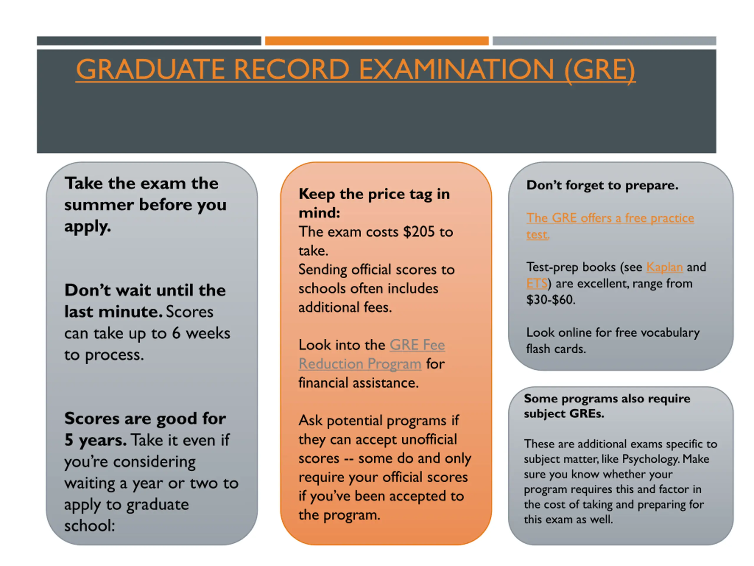 GRADUATE RECORD EXAMINATION (GRE) Take the exam the summer before you apply. Don t forget to prepare. Keep the price tag in mind: The exam costs $205 to take. Sending official scores to schools often includes additional fees. The GRE offers a free practice test. Test-prep books (see Kaplan and ETS) are excellent, range from $30-$60. Don t wait until the last minute. Scores can take up to 6 weeks to process. Look online for free vocabulary flash cards. Look into the GRE Fee Reduction Program for financial assistance. Some programs also require subject GREs. Scores are good for 5 years. Take it even if you re considering waiting a year or two to apply to graduate school: Ask potential programs if they can accept unofficial scores -- some do and only require your official scores if you ve been accepted to the program. These are additional exams specific to subject matter, like Psychology. Make sure you know whether your program requires this and factor in the cost of taking and preparing for this exam as well.